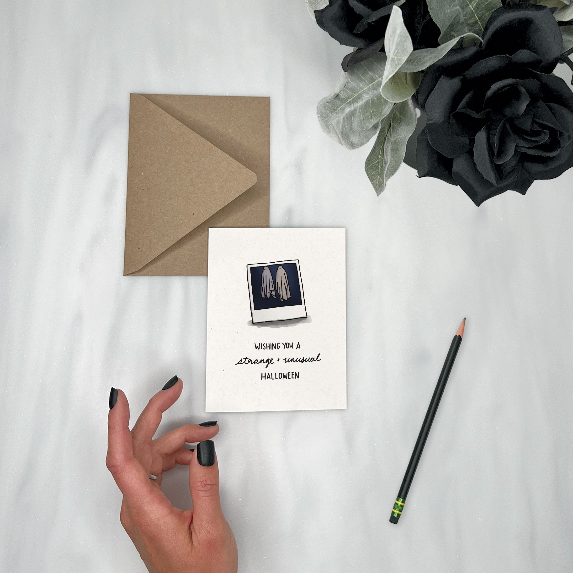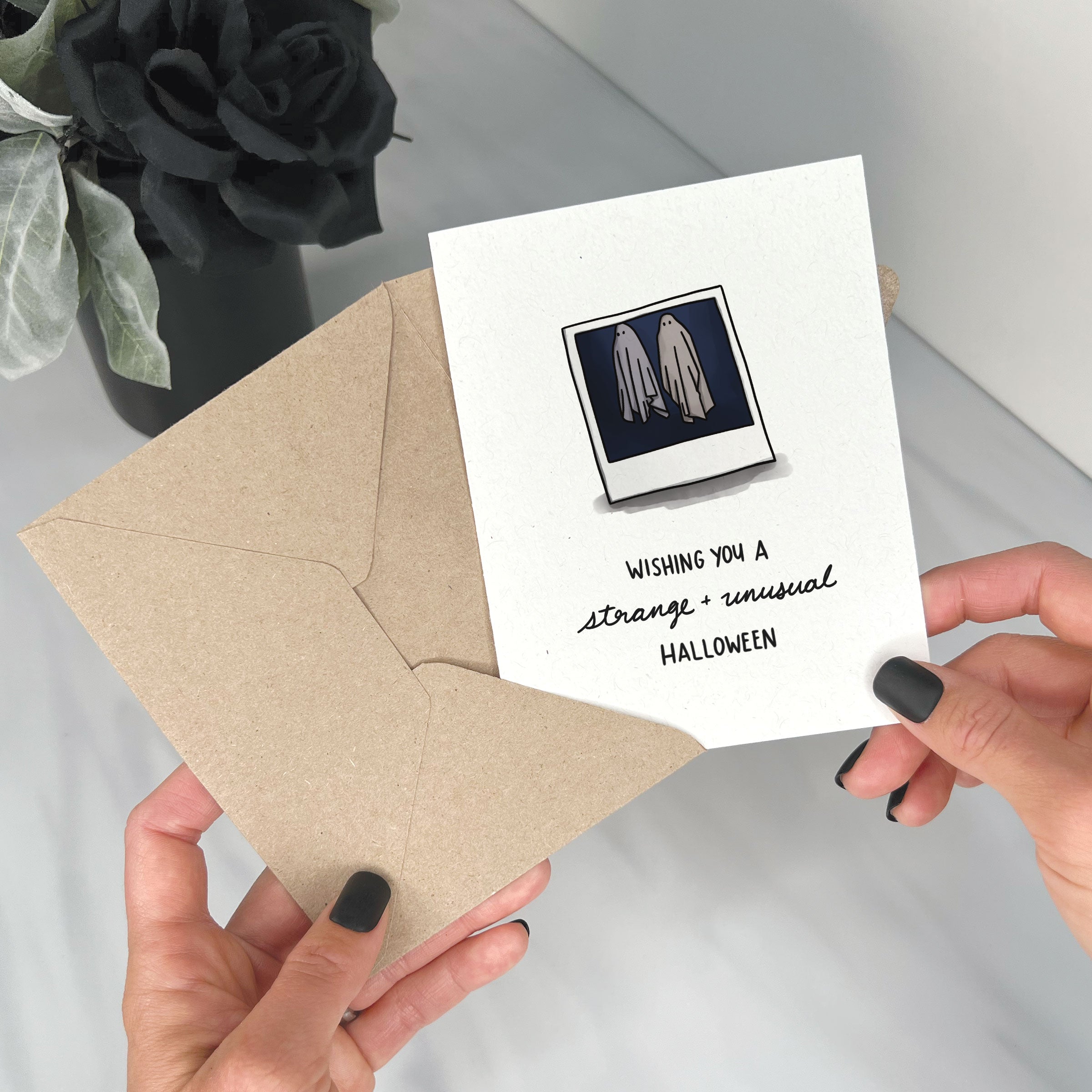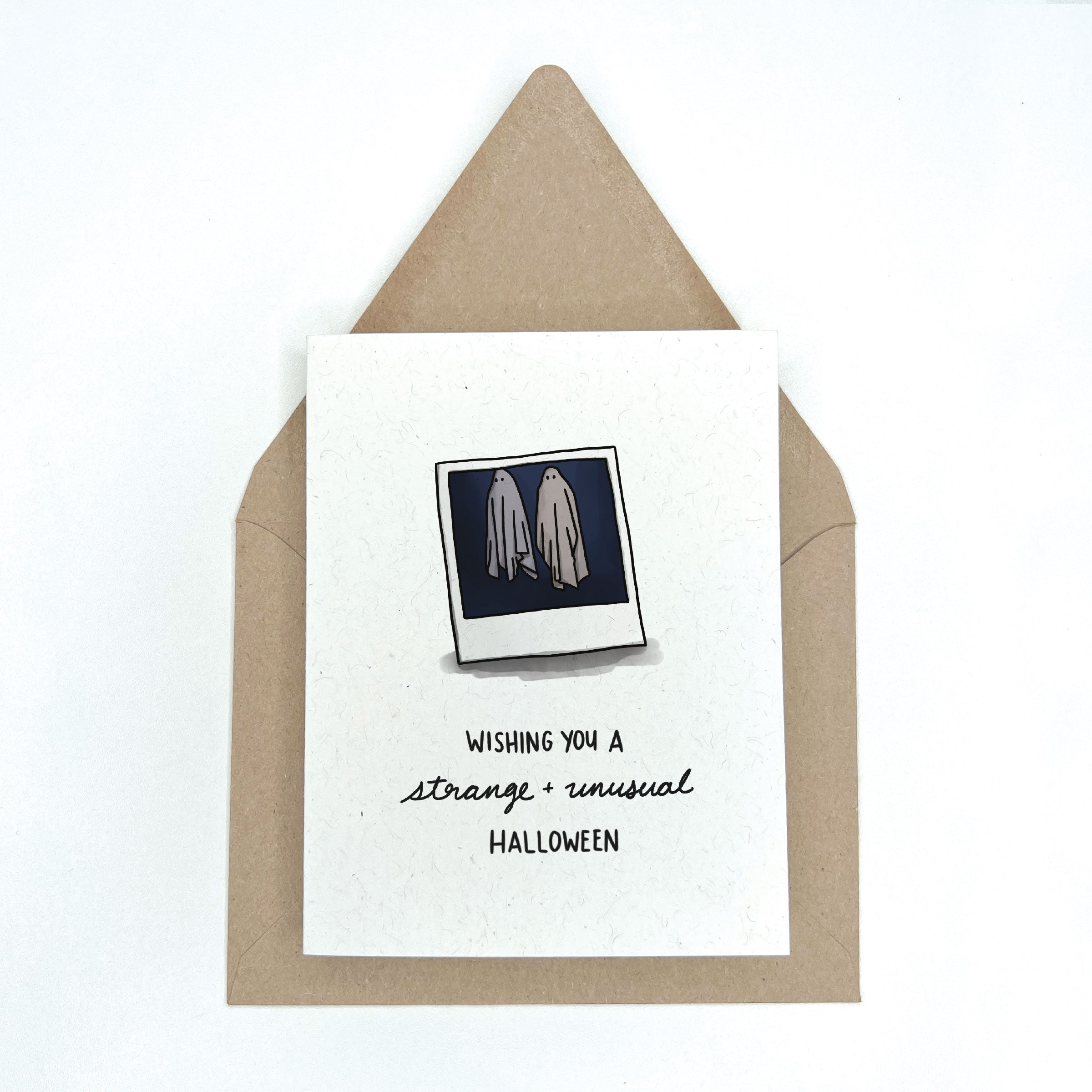 This eco friendly pop culture card features two ghosts in sheets on a polaroid photograph. The phrase "Wishing you a Strange and Unusual Halloween" references a famous line in the original Beetlejuice movie. Perfect for couples Halloween love. Blank on the inside. Paired with a kraft envelope.