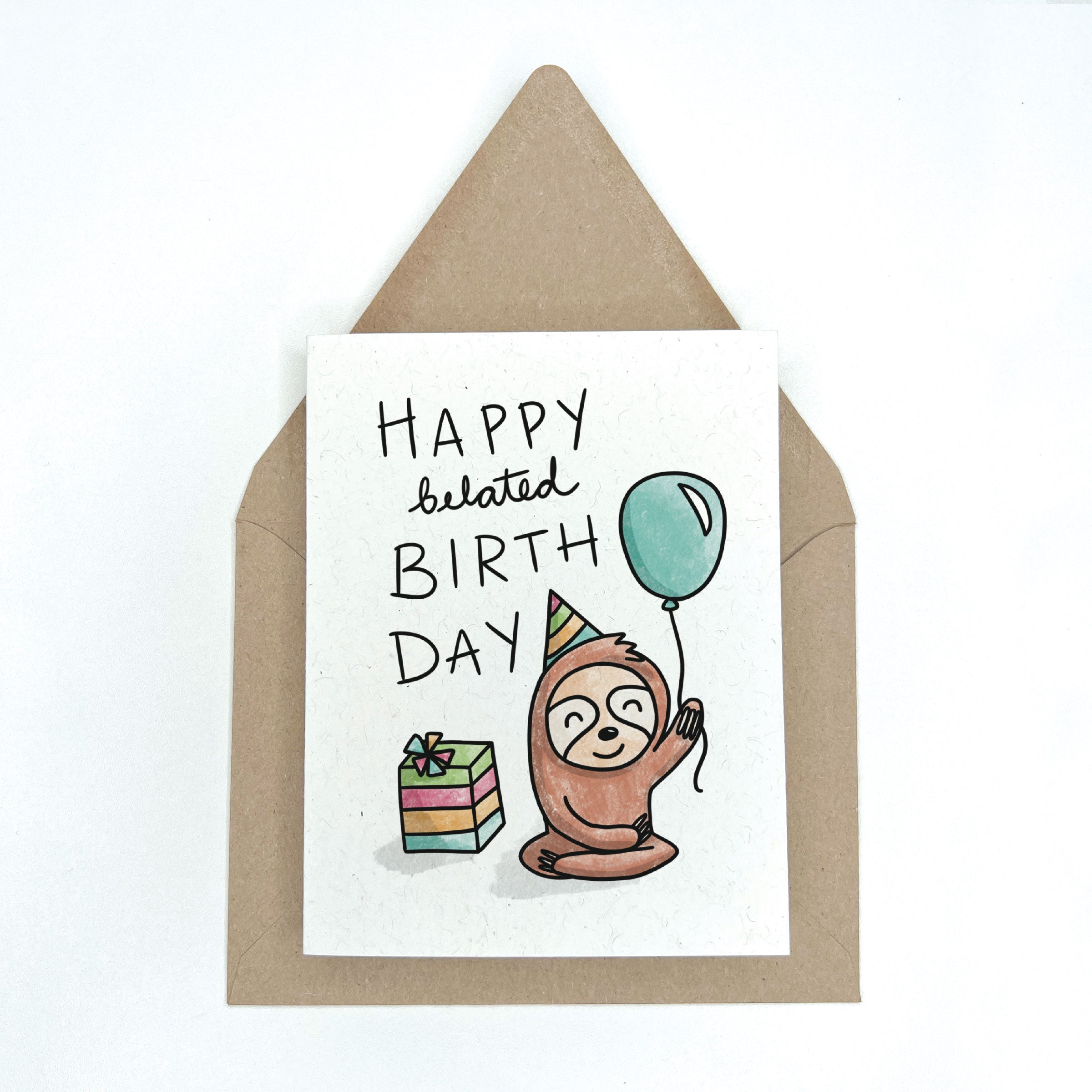 This eco friendly birthday card features an adorable sloth wearing a party hat holding a blue balloon along with the handwritten phrase "Happy belated birthday". Perfect for both children & adults alike. Blank on the inside. Paired with a kraft envelope.