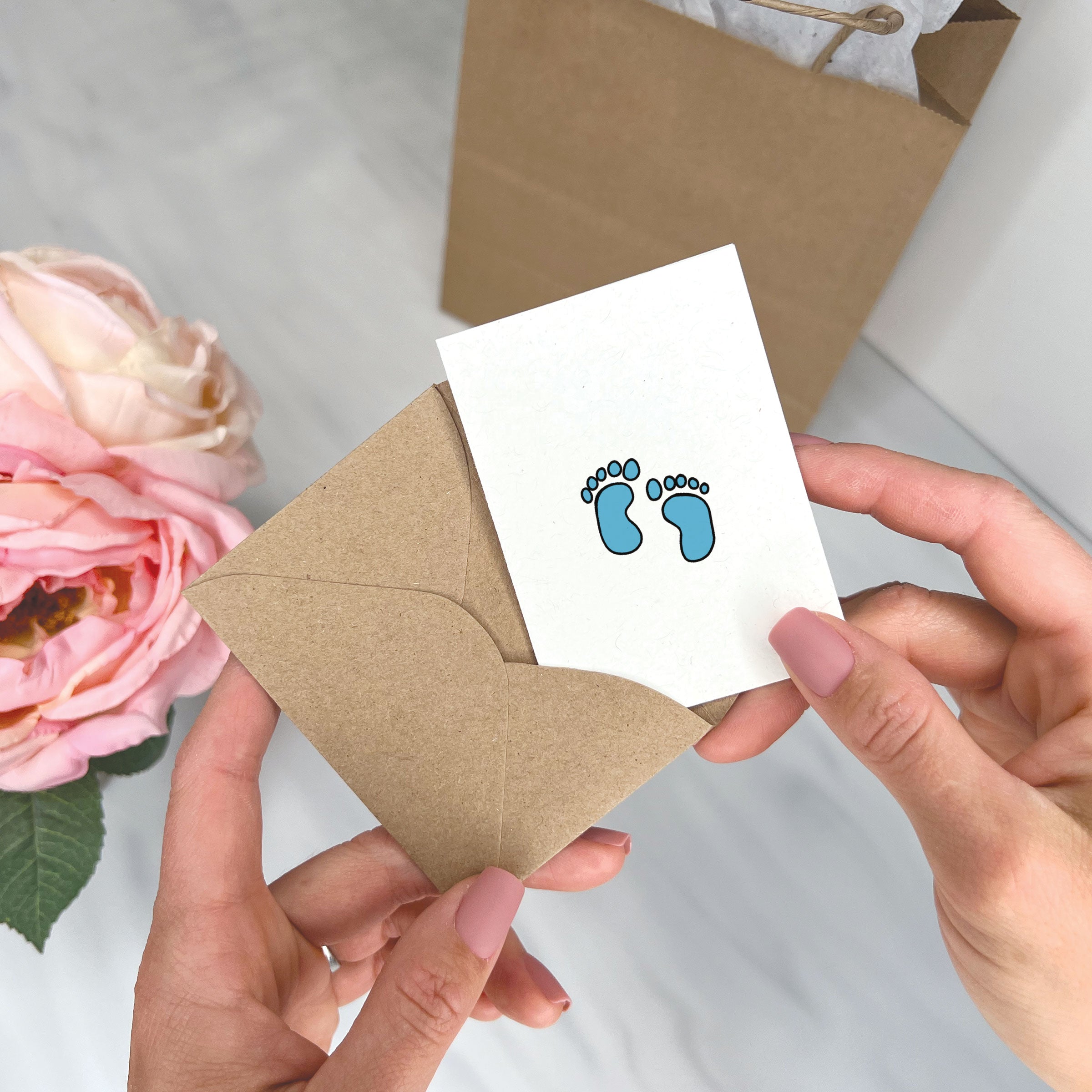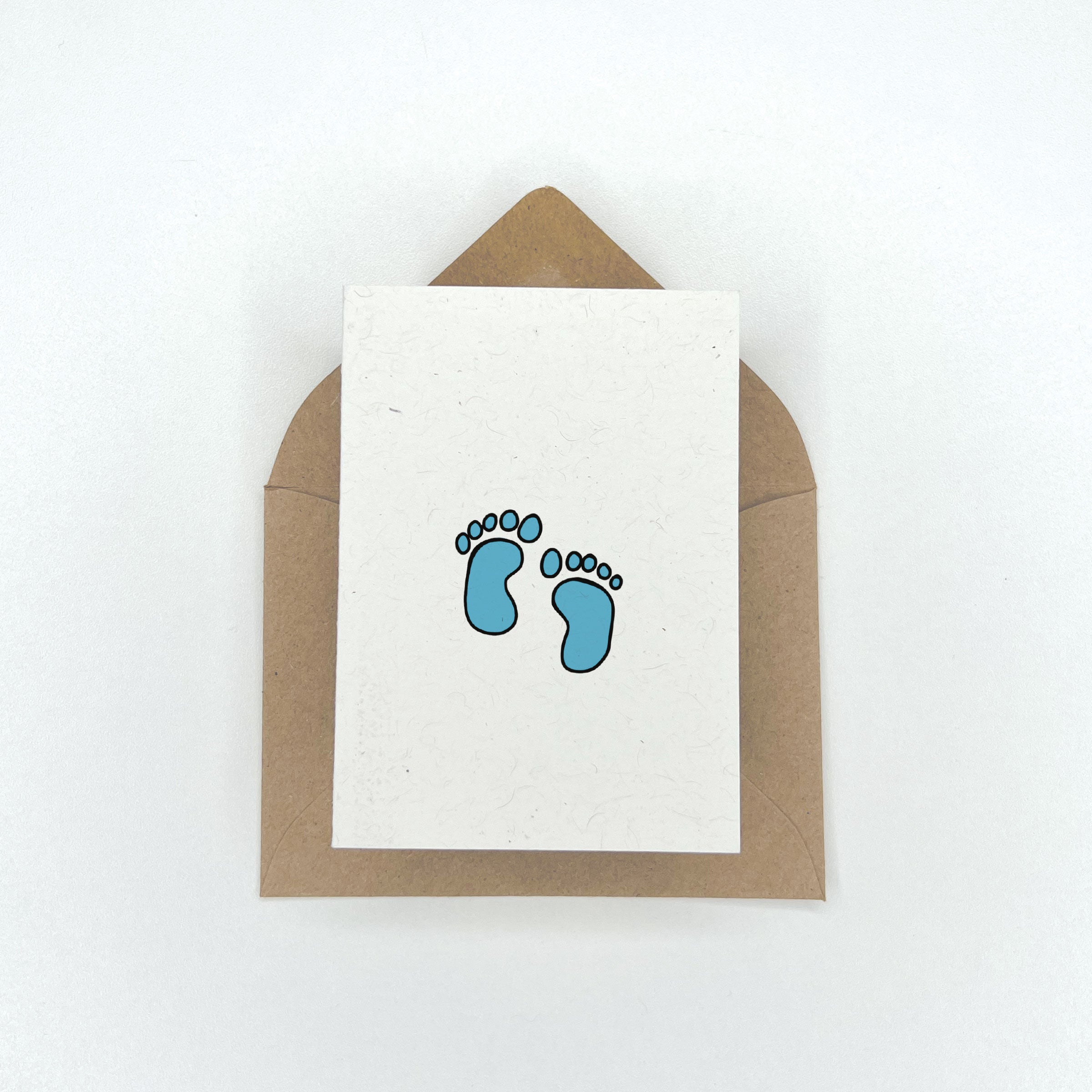 This eco friendly baby shower card features a pair of cute baby feet. This can be used for a baby boy, baby girl, or a gender neutral shower. Blank on the inside. Paired with a kraft envelope.