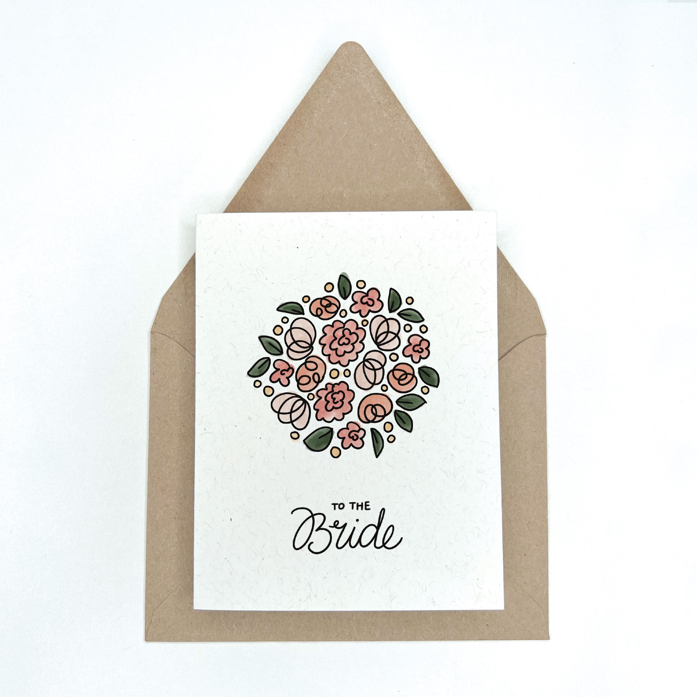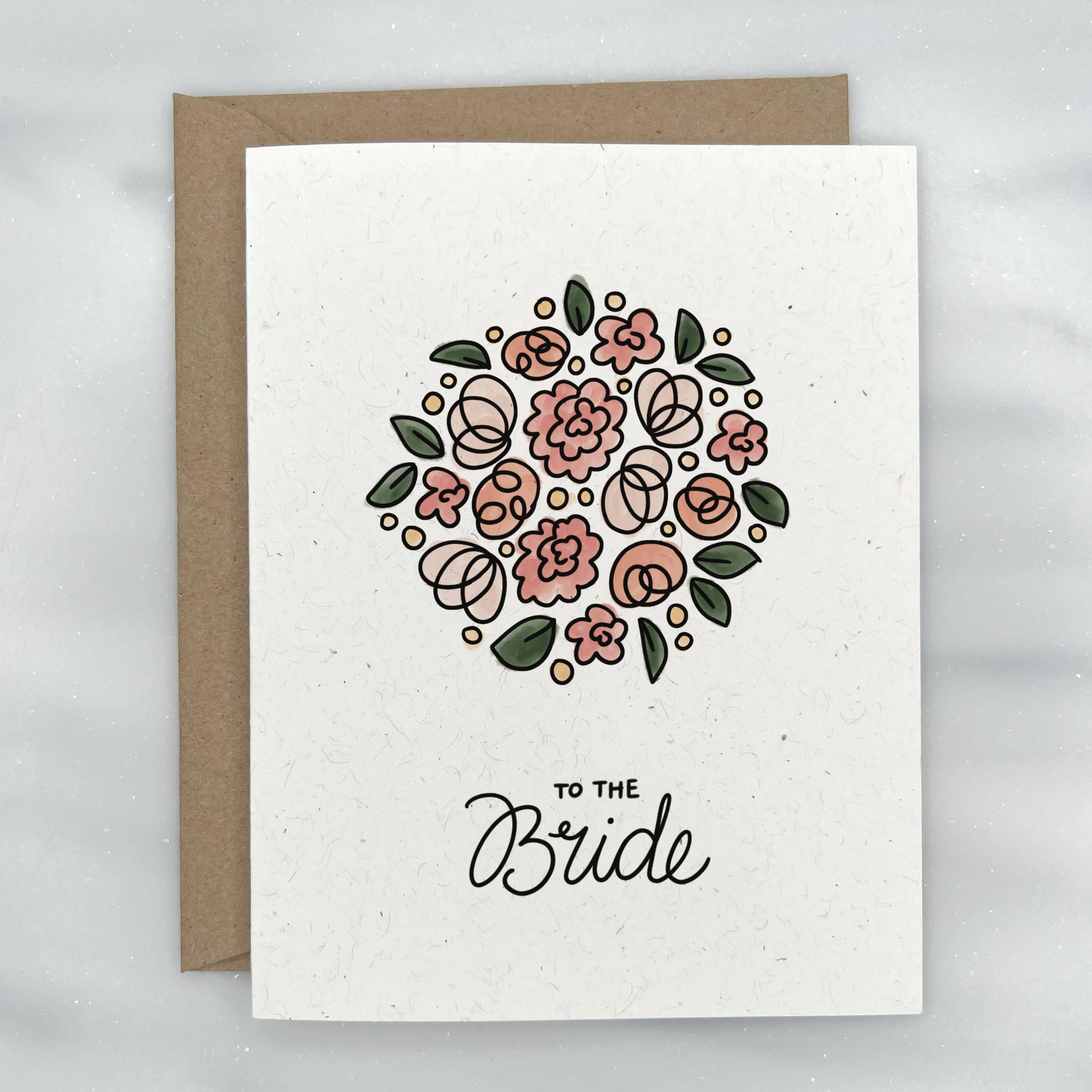 This eco friendly wedding card features a beautiful abstract bouquet of pink flowers with the phrase "To the Bride" written underneath. Great for a wedding card, but can also be used as a bridal shower card or wedding congratulations card. Perfect for the new bride or bride to be! Blank on the inside. Paired with a kraft envelope.