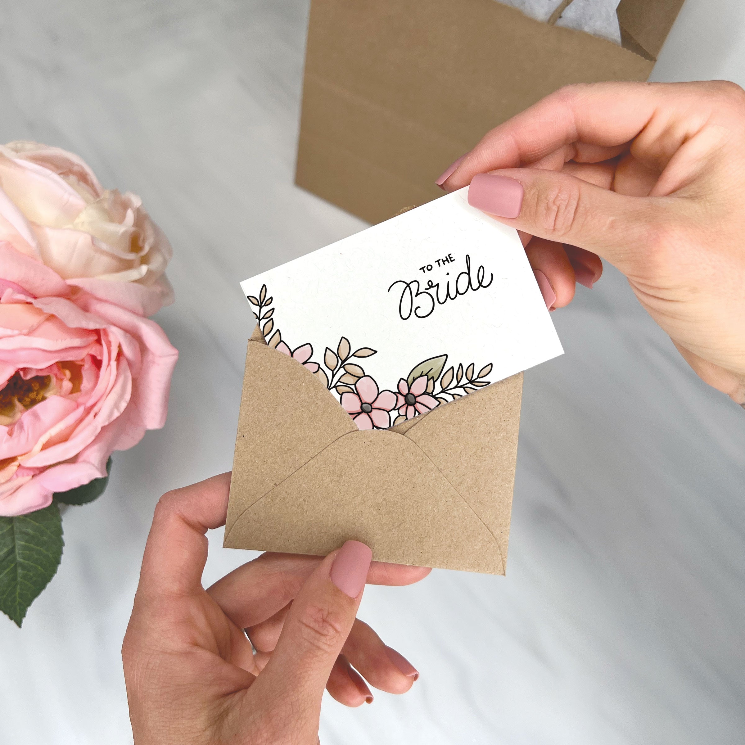 This eco friendly bridal shower card features the phrase "To The Bride" with a floral illustration in the corner. This item is great to use for a bridal shower or engagement gift. Blank on the inside. Paired with a kraft envelope.