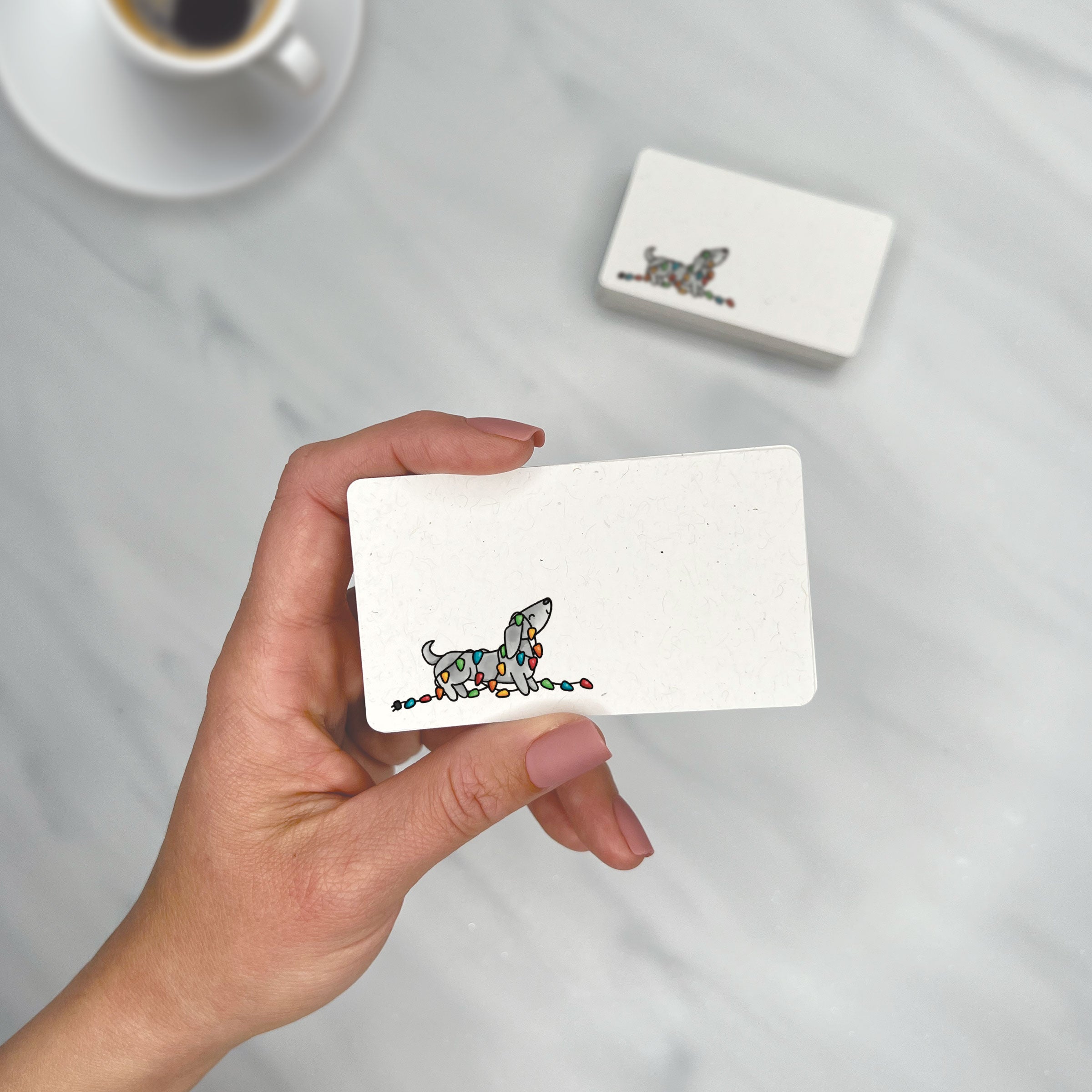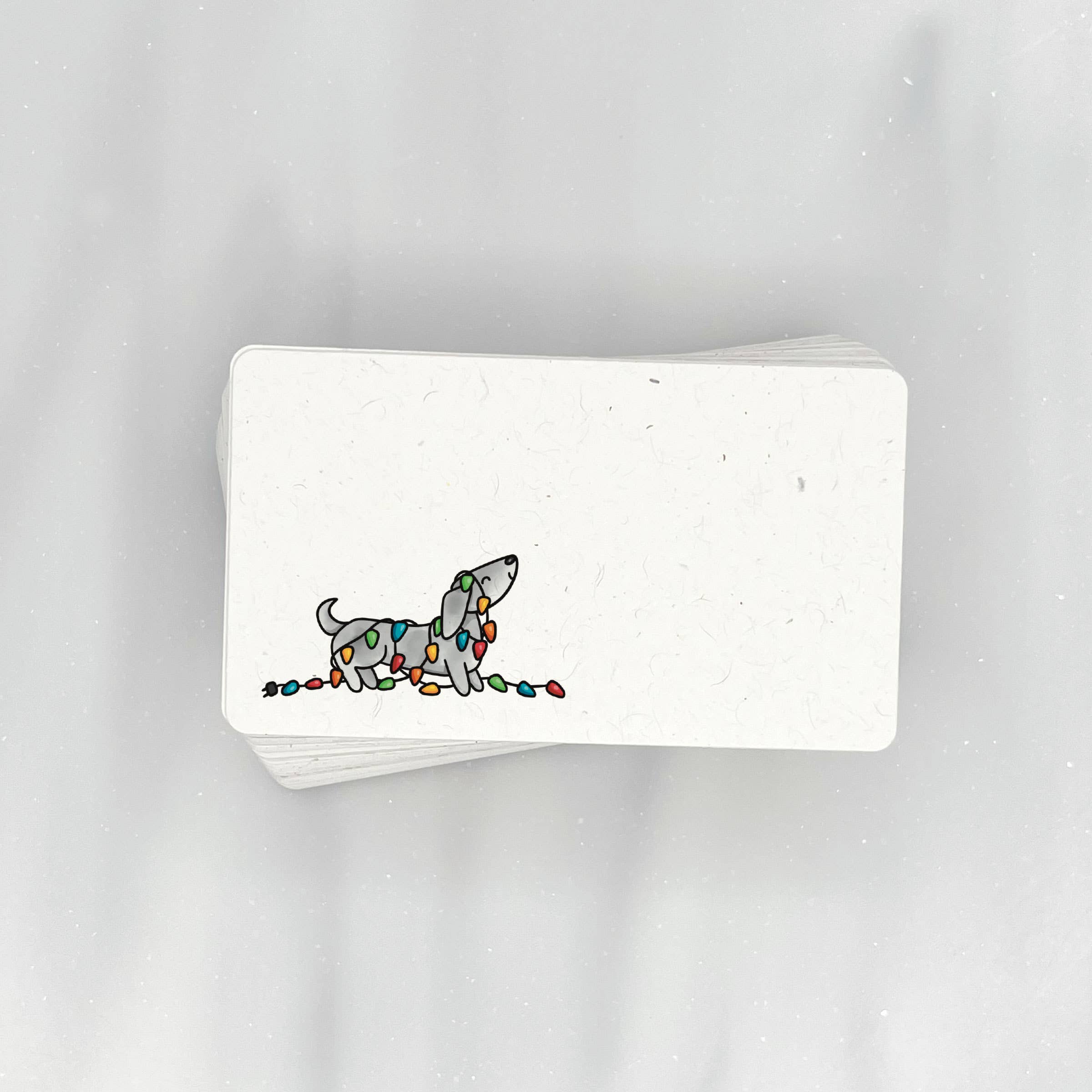These eco friendly mini note cards feature a cute dog wrapped in lights and are great for kids and adults alike. Design on the front. Blank on the back. 56 mini notes per pack.