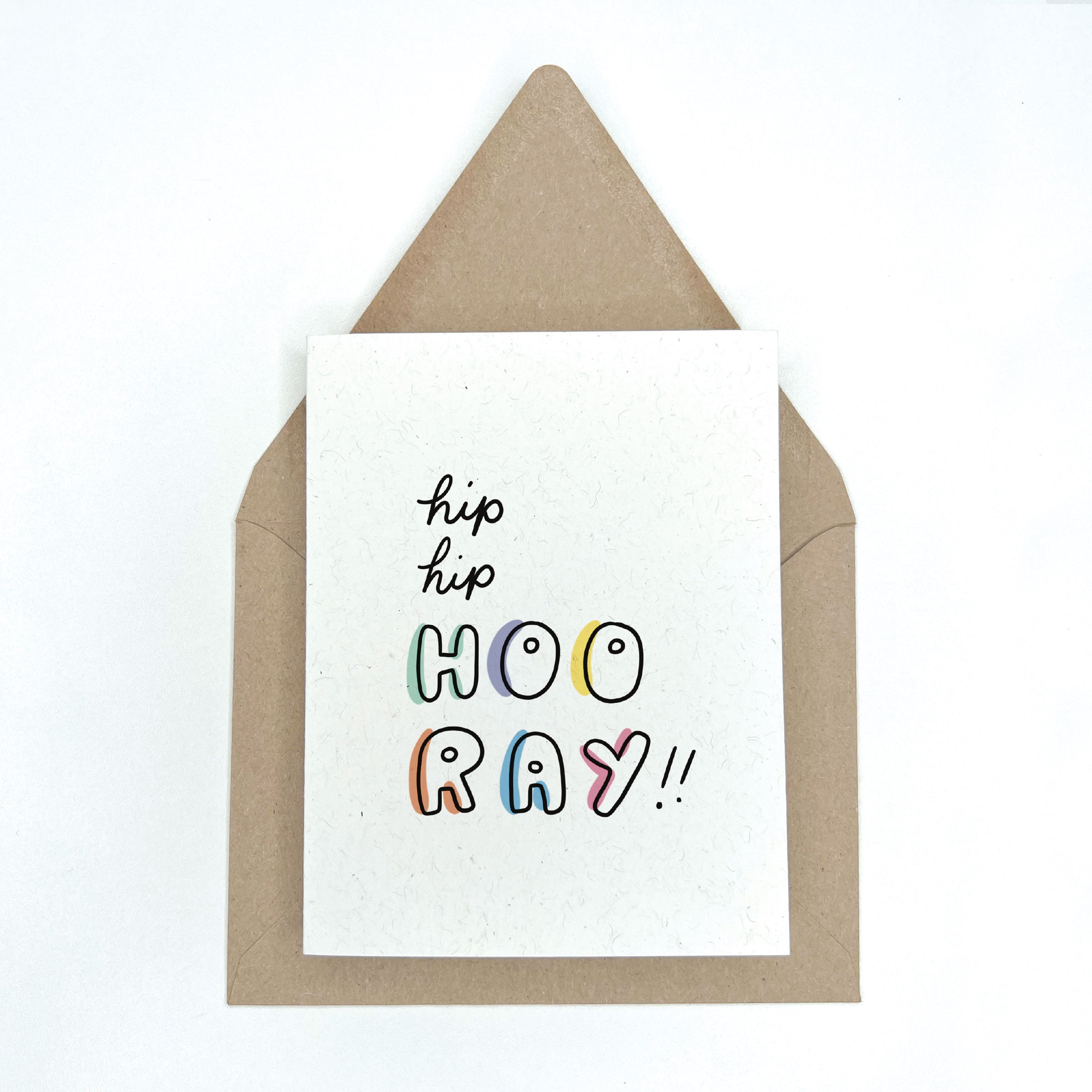 This eco friendly greeting card features the phrase "Hip Hip Hooray" written in a bubble style font filled in bright colors. Great for a birthday card, but can also be used as a celebration card or congratulations card. Perfect for both children & adults alike. Blank on the inside. Paired with a kraft envelope.