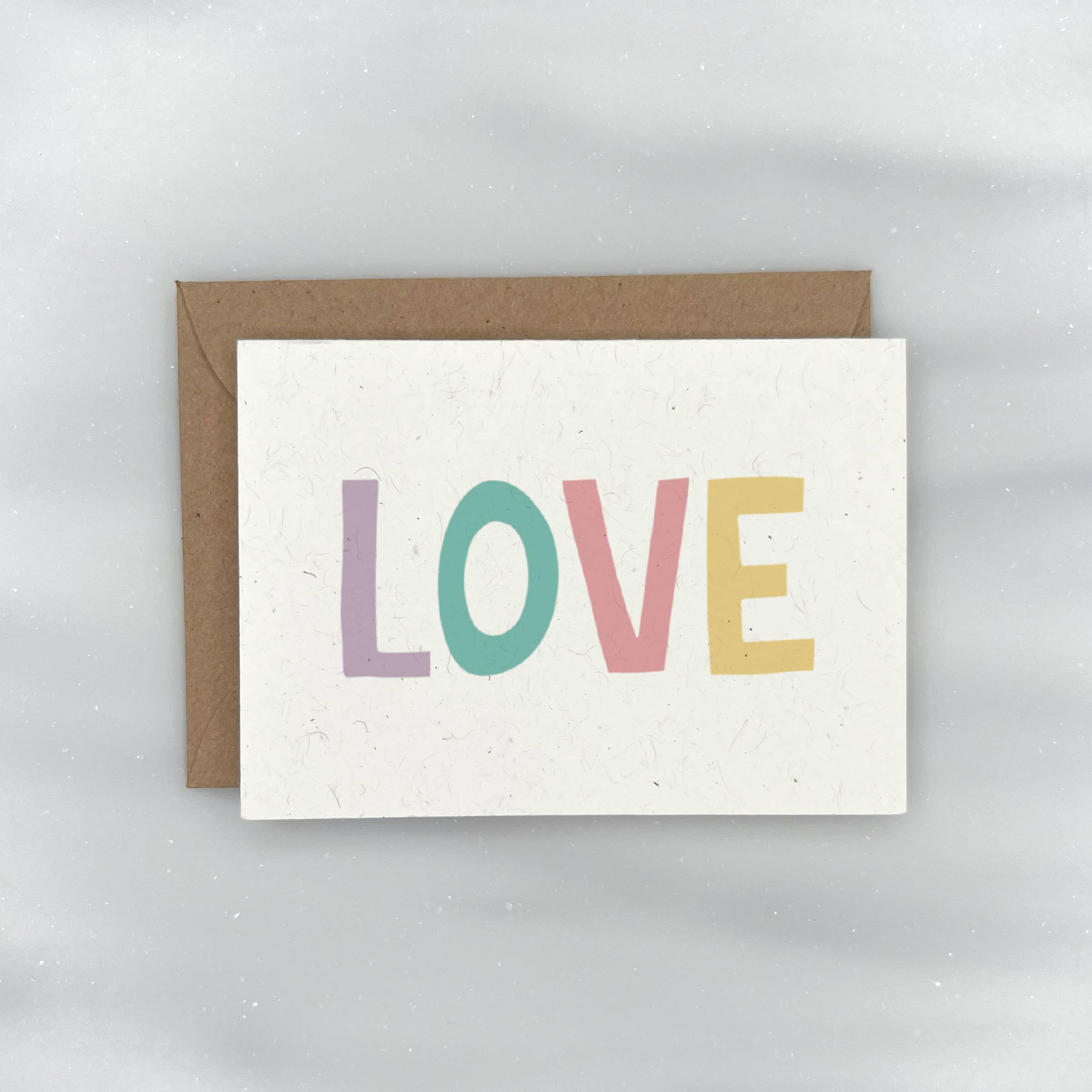 This eco friendly card features the the word "LOVE" in colorful text. Perfect for an anniversary, wedding, or friend gift. Blank on the inside. Paired with a kraft envelope.