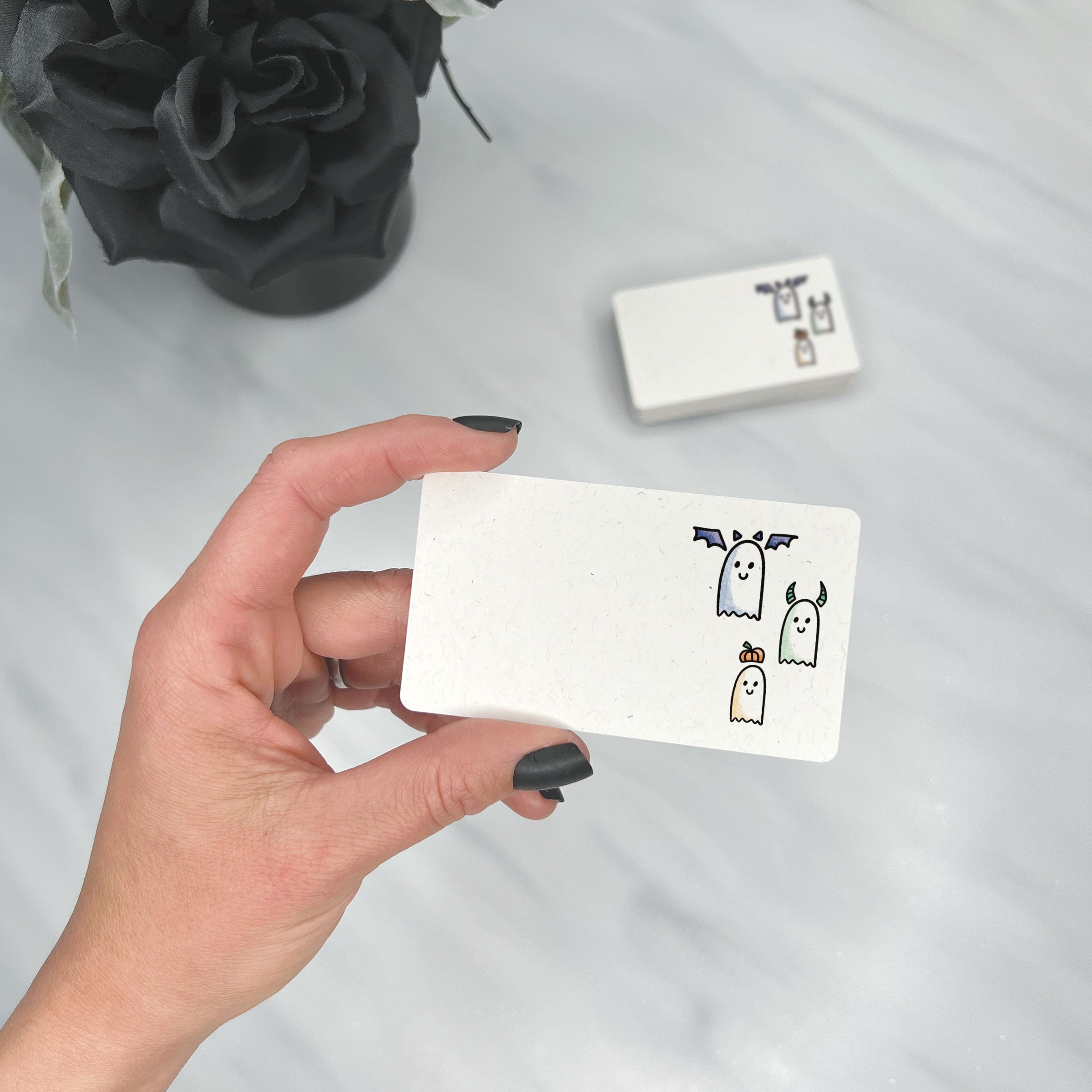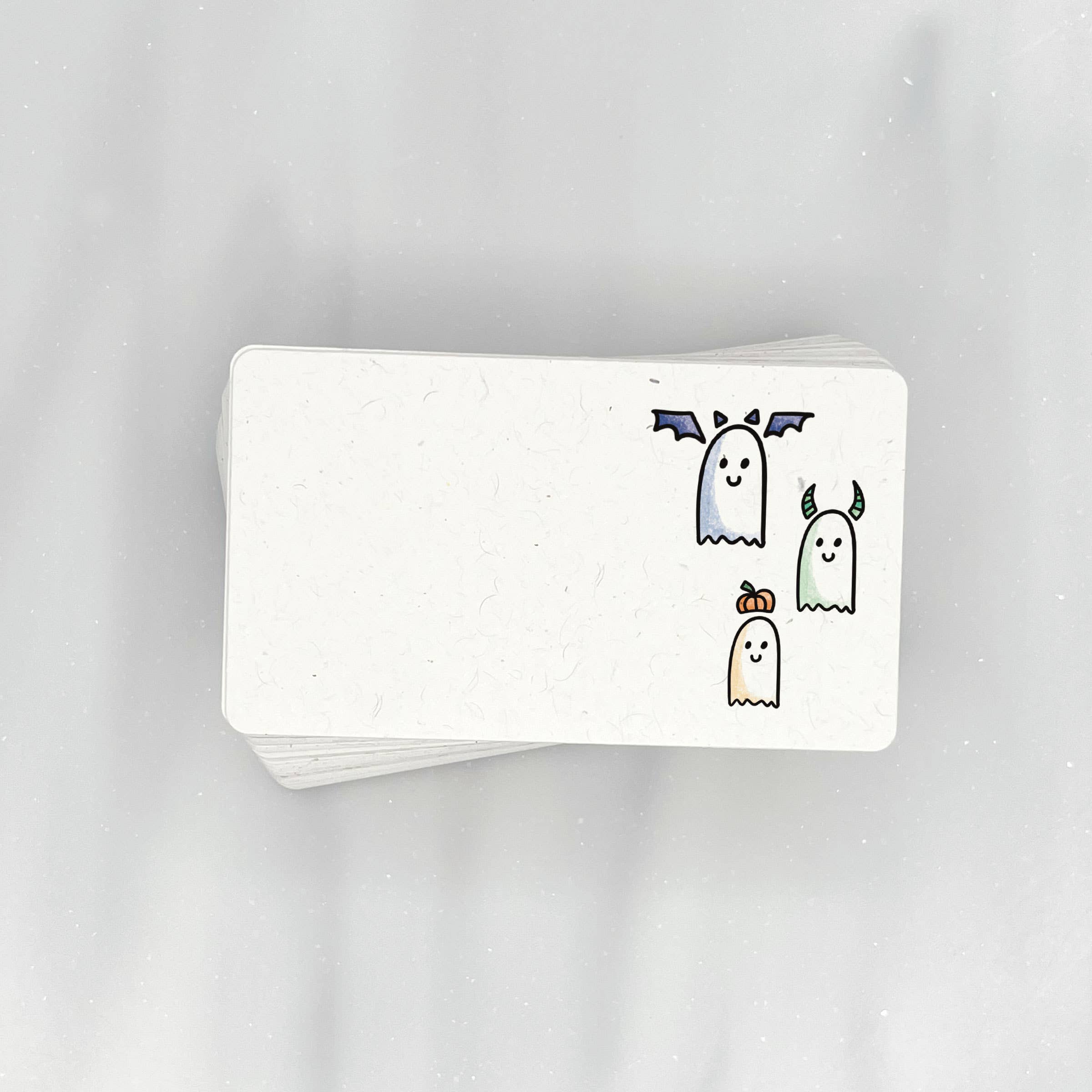 These eco friendly mini note cards feature 3 ghosts and are great for kids and adults alike. Design on the front. Blank on the back. 56 mini notes per pack.