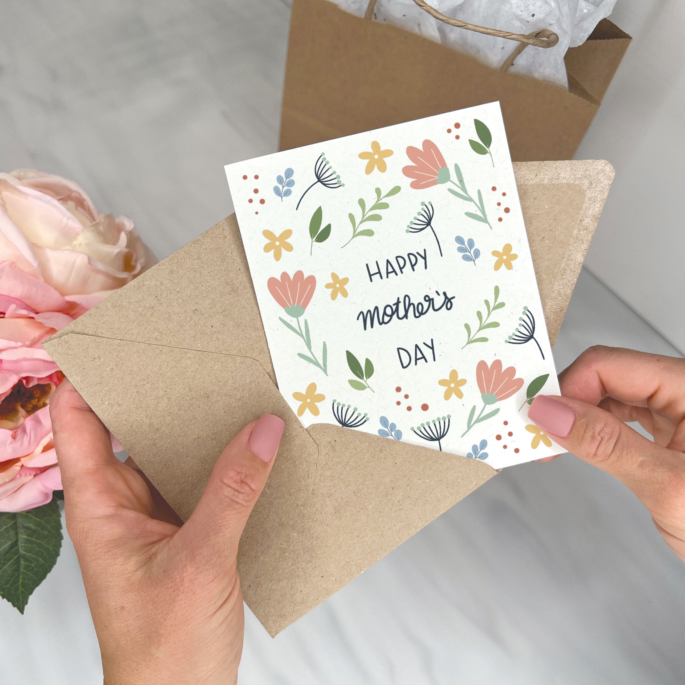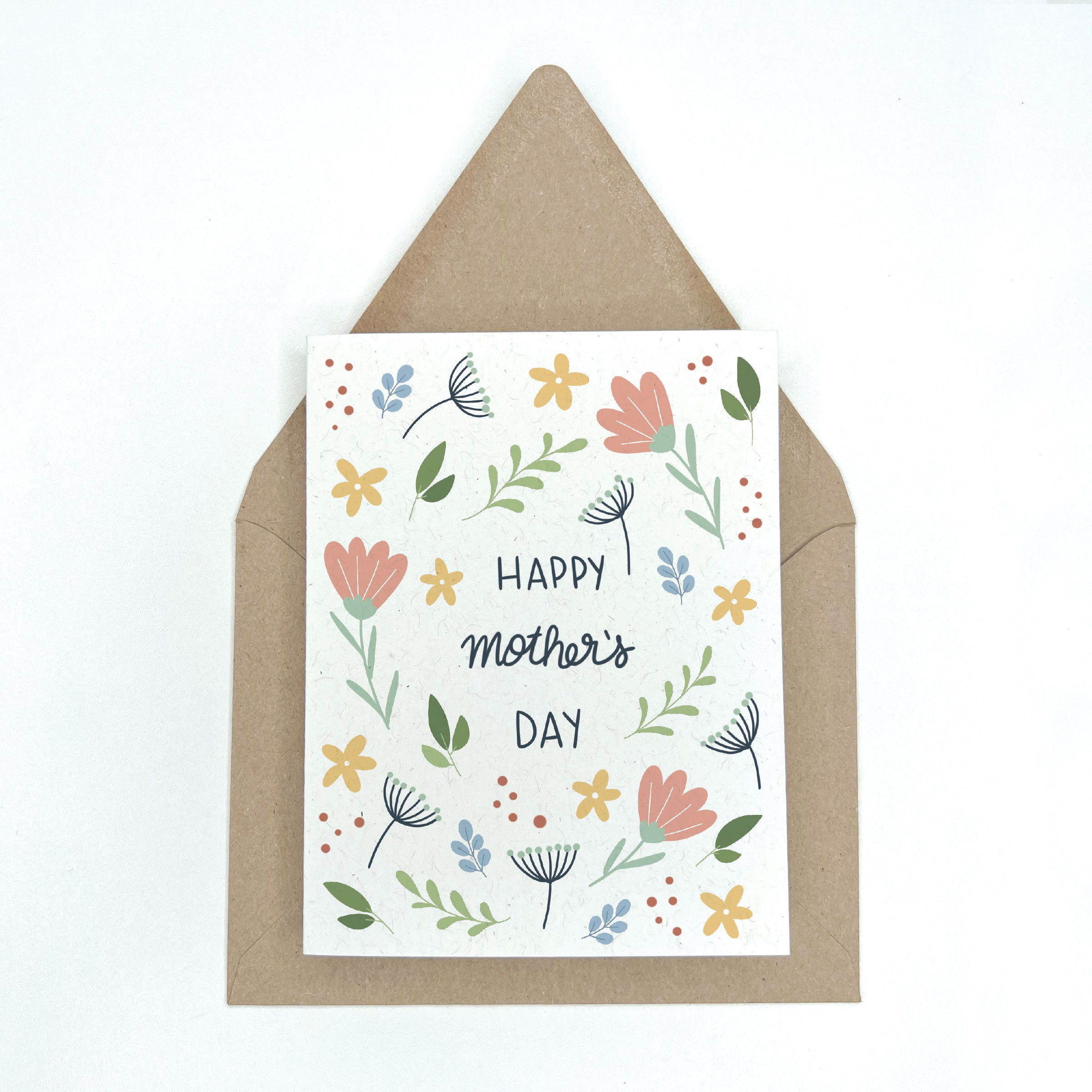This beautiful Mother's Day card features lots of colorful flowers & plants and the phrase "Happy Mother's Day". Perfect for Mother's Day from children or spouse. Blank on the inside. Paired with a kraft envelope.
