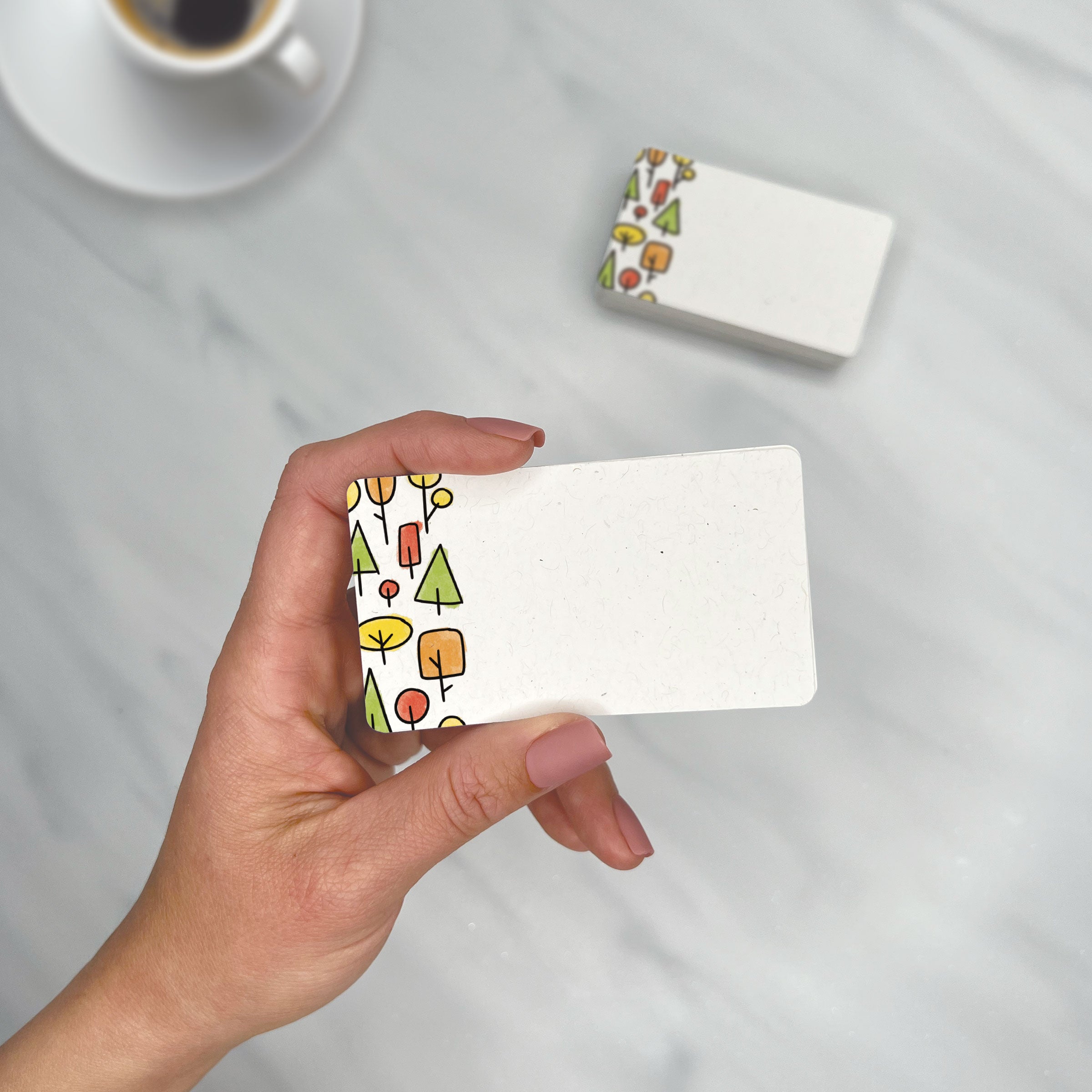 These eco friendly mini note cards feature geometric style trees and are great for kids and adults alike. Design on the front. Blank on the back. 56 mini notes per pack.