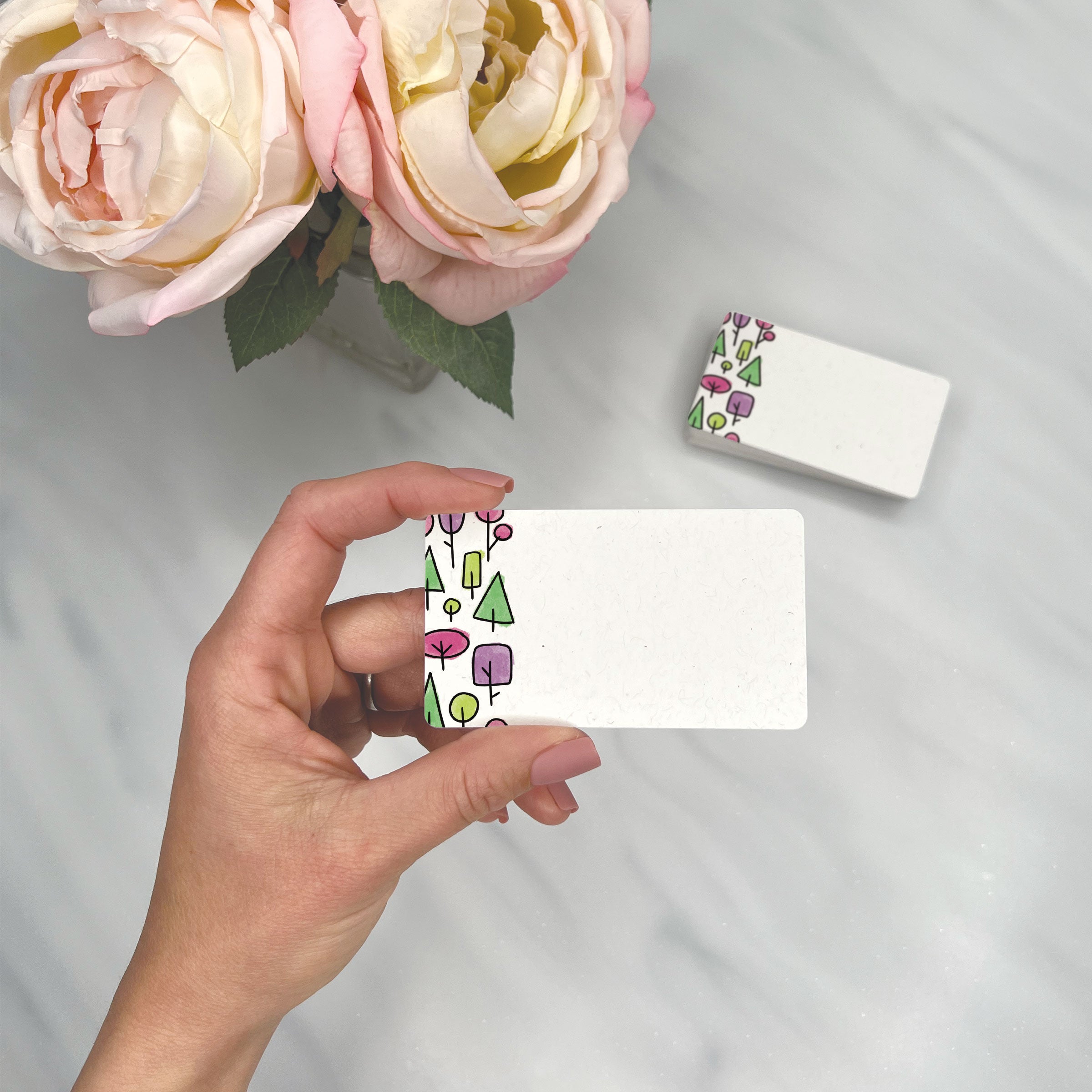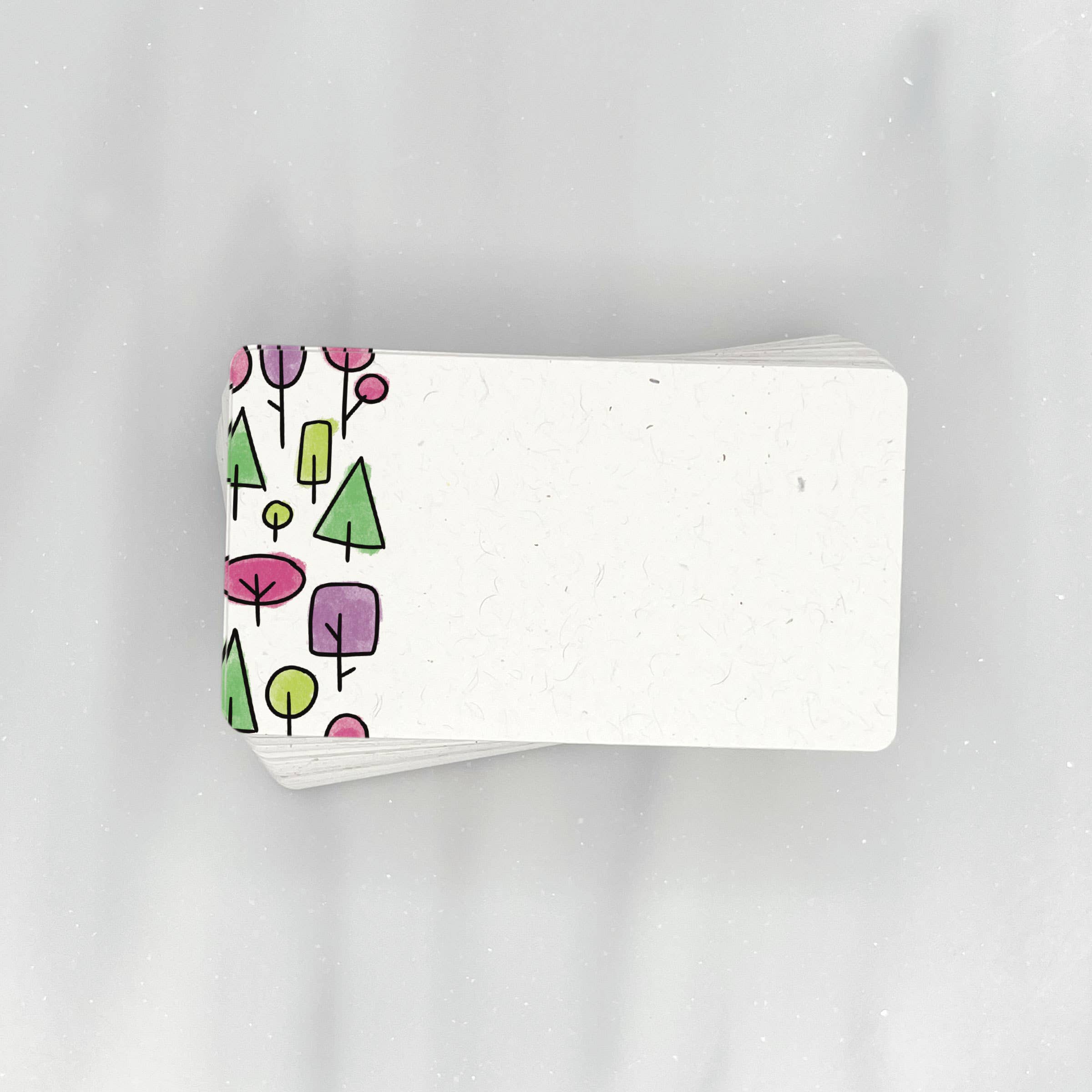 These eco friendly mini note cards feature geometric style trees and are great for kids and adults alike. Design on the front. Blank on the back. 56 mini notes per pack.