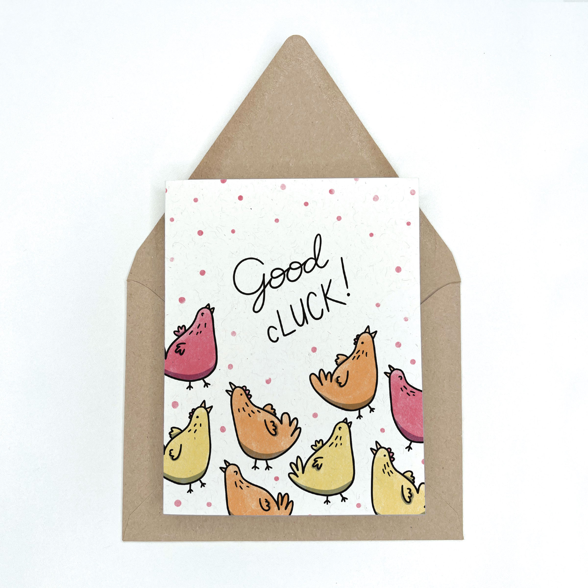 This cute eco friendly sympathy card features a group of chickens and the phrase "Good cLuck". Great as an encouragement card & perfect for both children & adults alike. Blank on the inside. Paired with a kraft envelope.