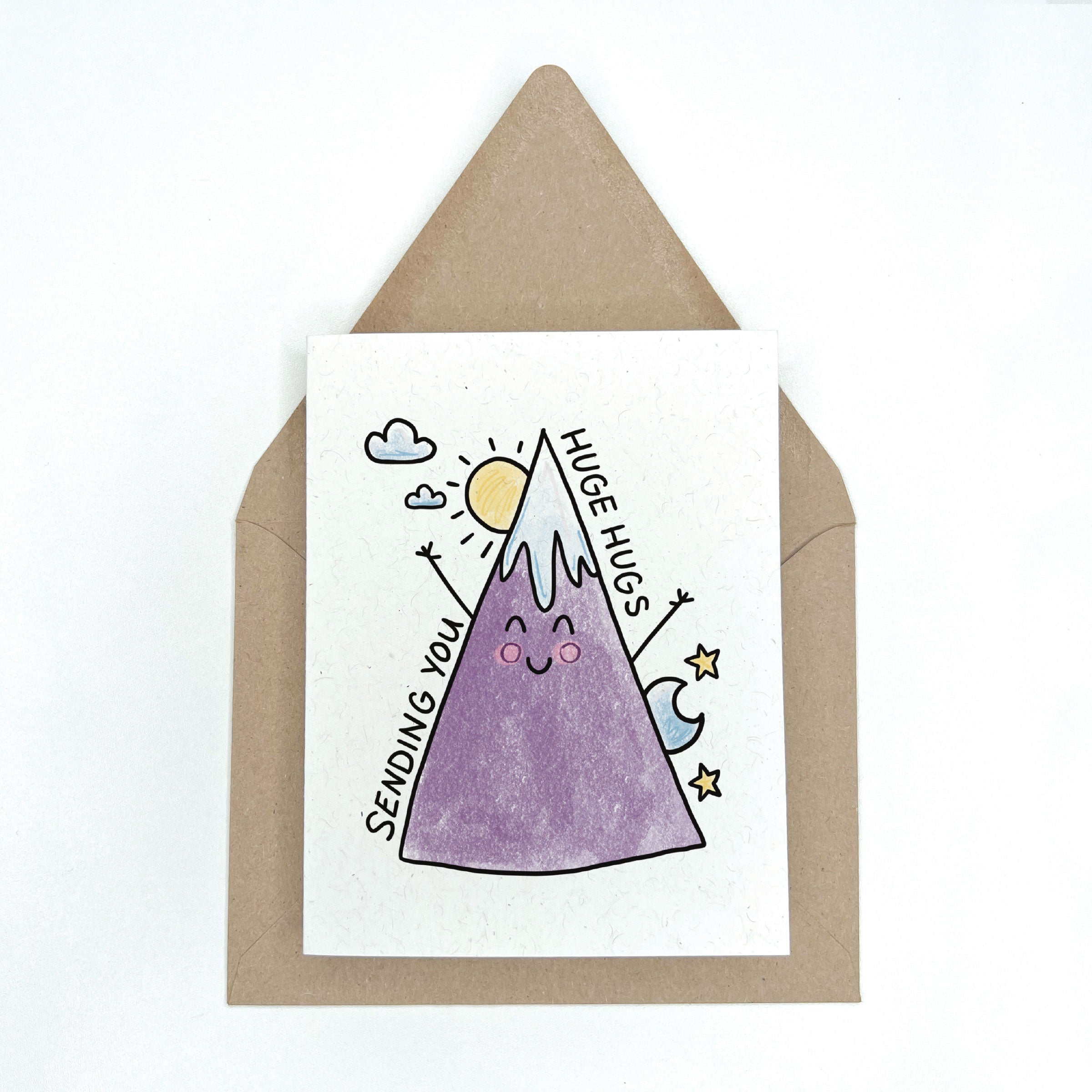 This cute eco friendly sympathy card features a happy mountain with outstretched arms with the handwritten phrase "Sending you huge hugs". Great as a thinking of you card, get well card, or even just a friendship card. Perfect for both children & adults alike. Blank on the inside. Paired with a kraft envelope.