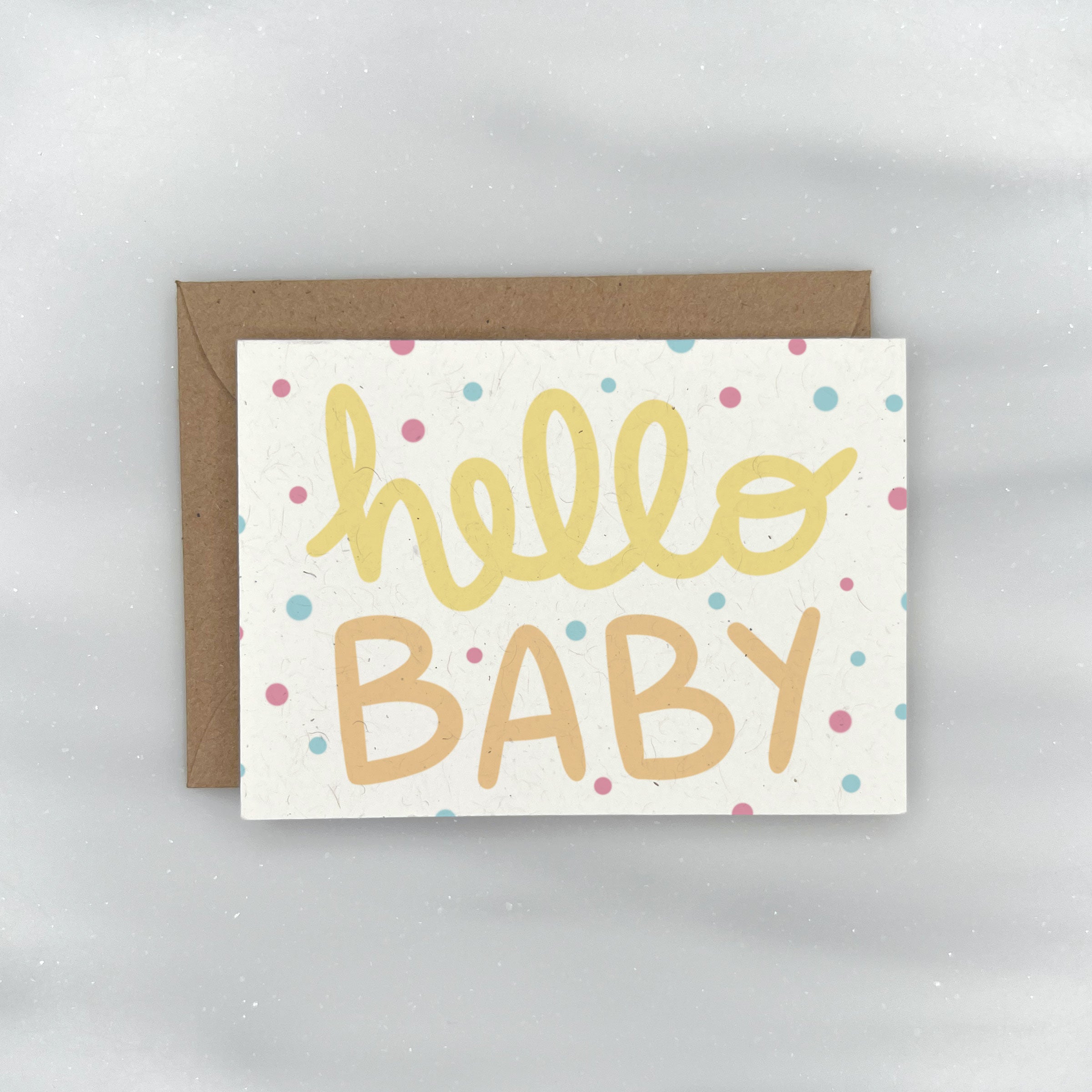 This eco friendly baby shower card features the words "Hello Baby" and can be used for a baby boy, baby girl, or a gender neutral shower. Blank on the inside. Paired with a kraft envelope.