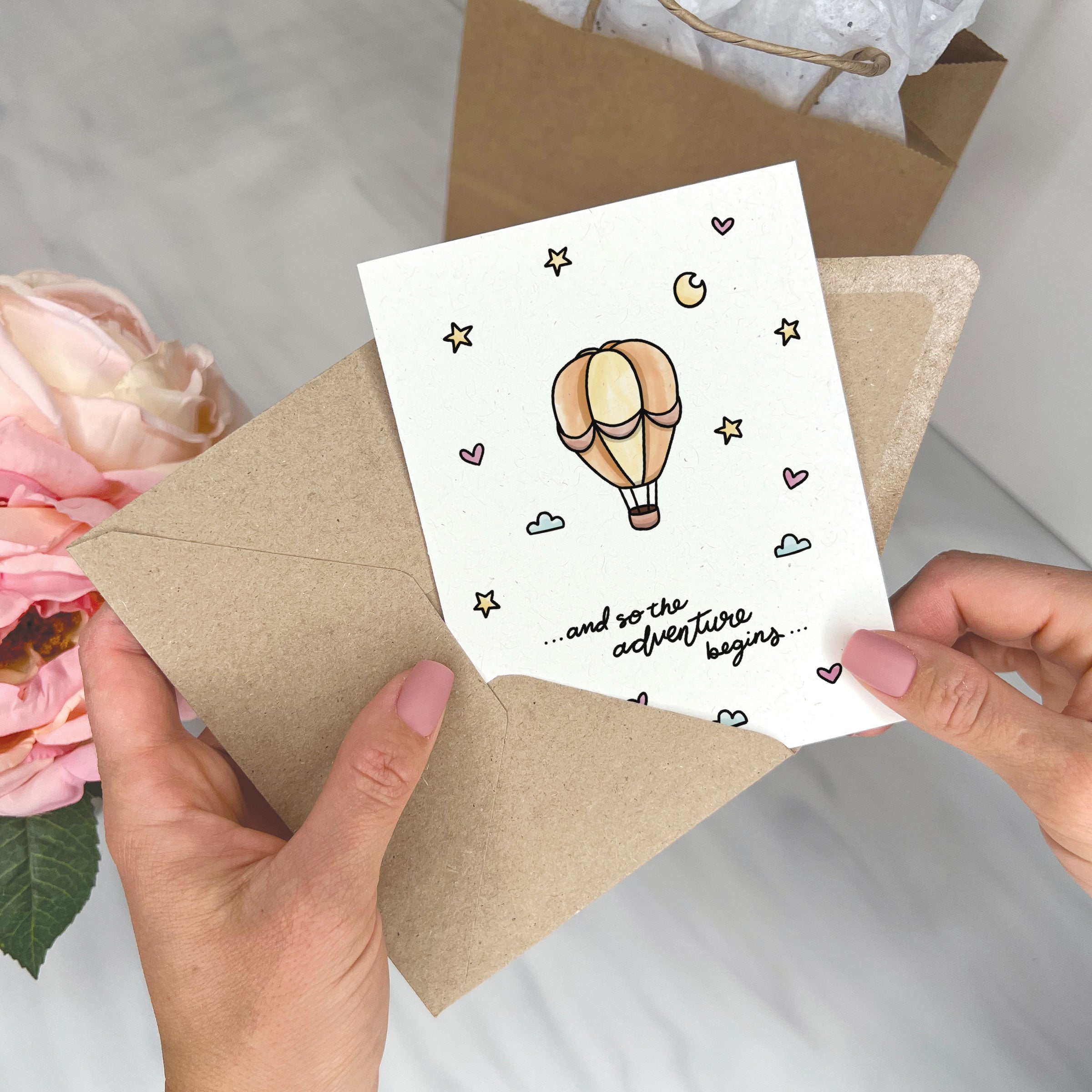 This eco friendly baby shower card features a whimsical hand-drawn image with a hot air balloon, clouds, hearts, stars, and a crescent moon. Incorporating the colors orange, yellow, pink, and blue, this card for the mom-to-be can be used for a baby boy, baby girl, or a gender neutral shower. Blank on the inside. Paired with a kraft envelope.