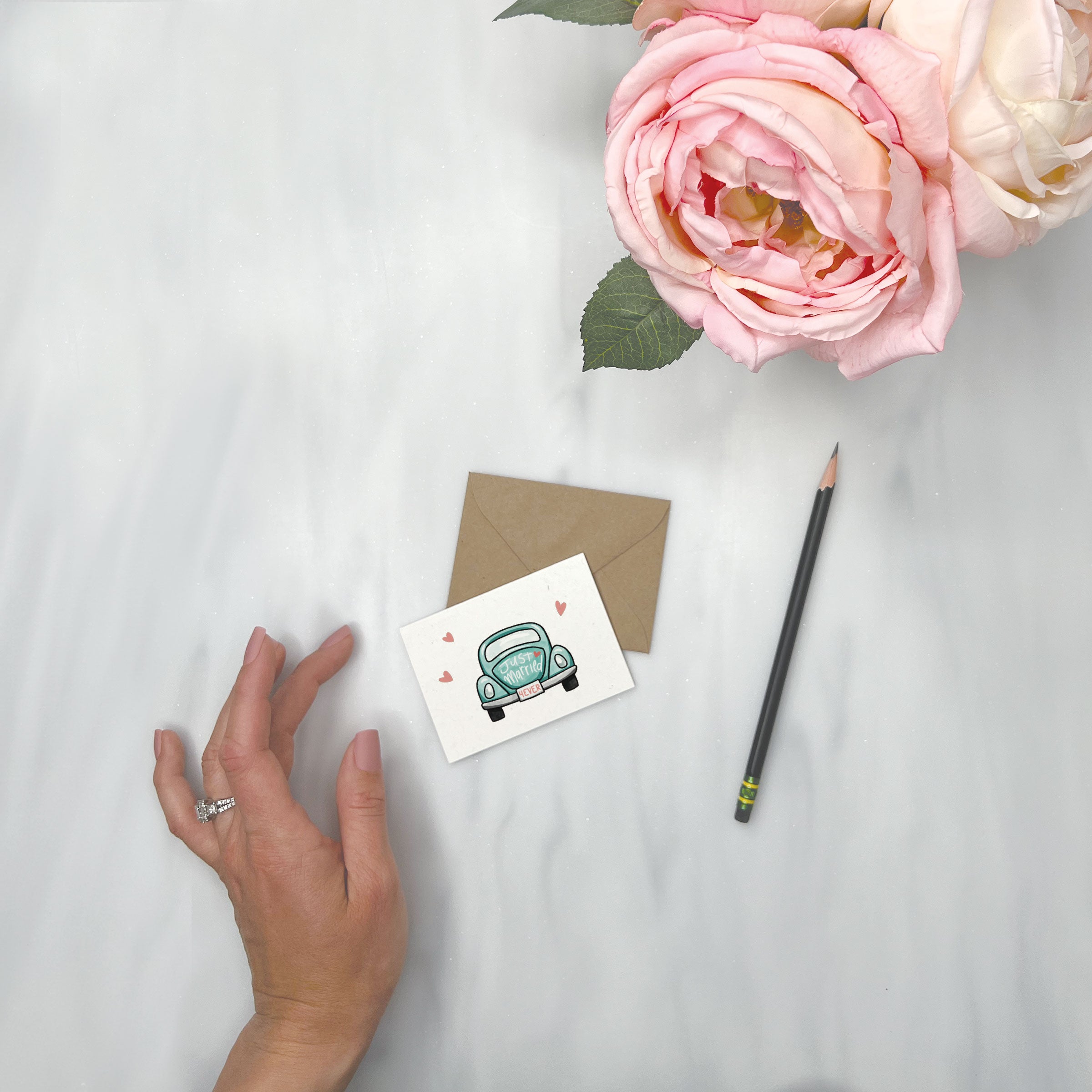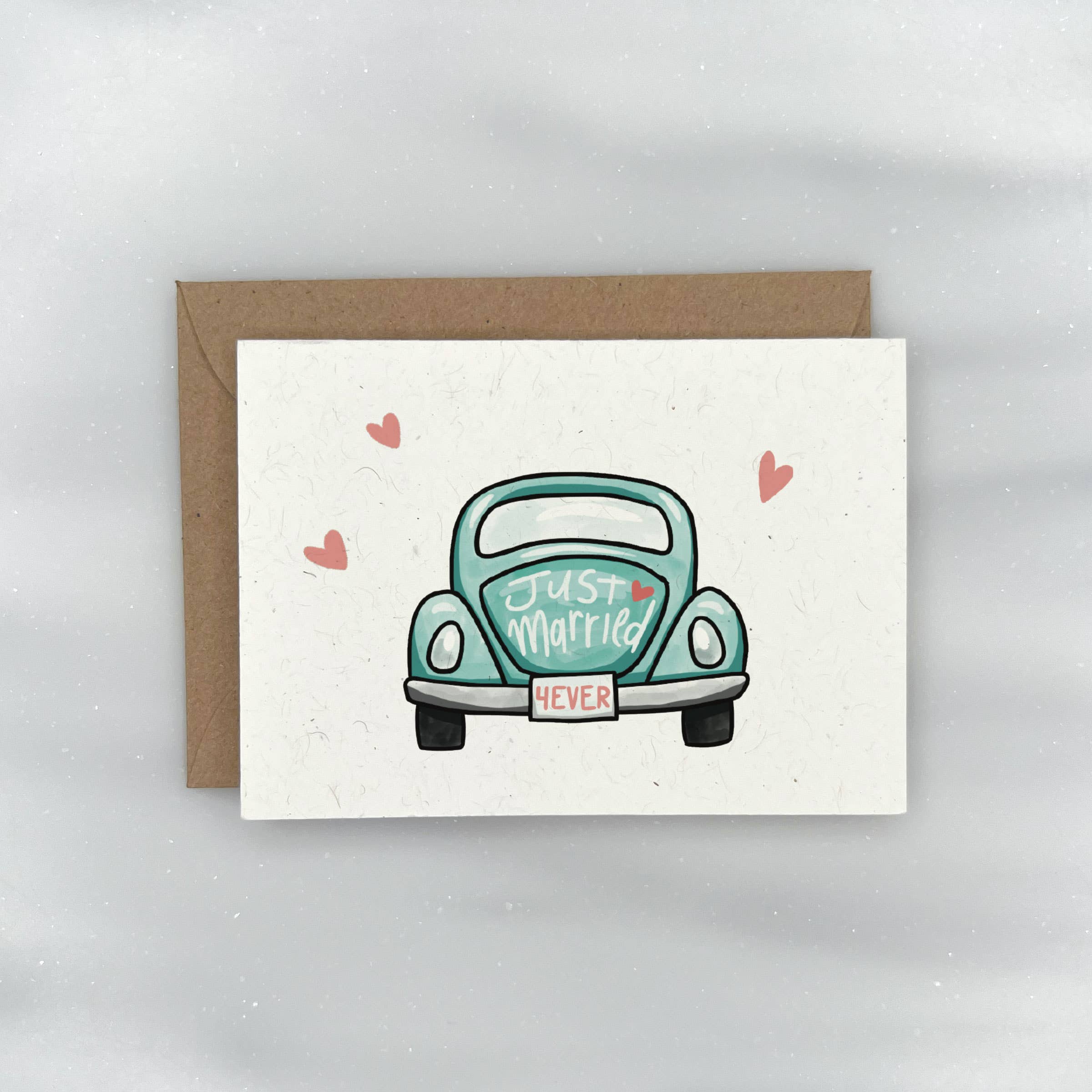 This eco friendly card features the back of a car with the phrase "Just Married" written on the back window. Perfect for a wedding or engagement gift. Blank on the inside. Paired with a kraft envelope.
