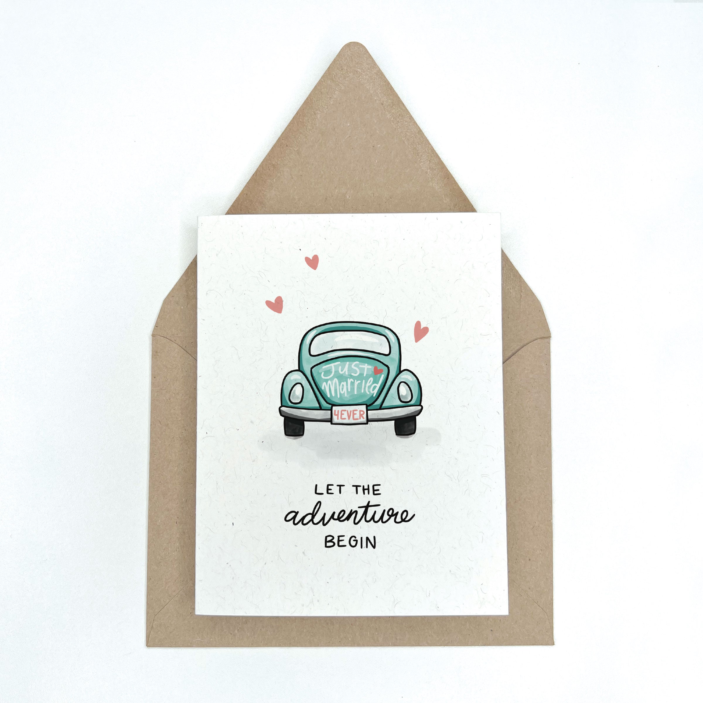 This eco friendly wedding card features a classic car with the words "Just Married" written on the back and the phrase "Let the Adventure Begin" written underneath. Great as a wedding card for a congratulating a couple on a recent marriage. Perfect for the new bride or bride to be! Blank on the inside. Paired with a kraft envelope.