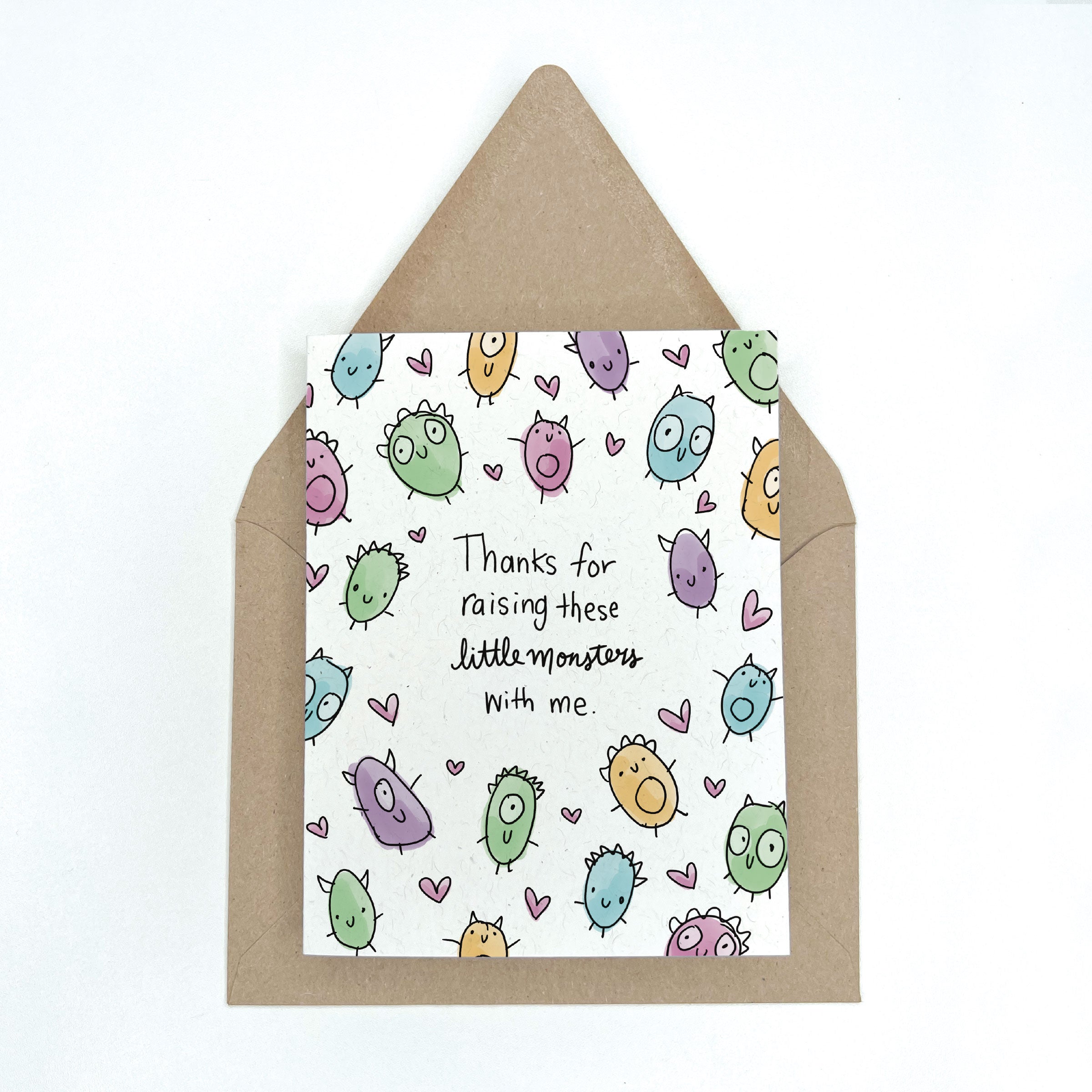 This cute love card features lots of cute & colorful little monsters and the phrase "Thanks for raising these little monsters with me". Perfect for Mother's or Father's day from spouse. Blank on the inside. Paired with a kraft envelope.