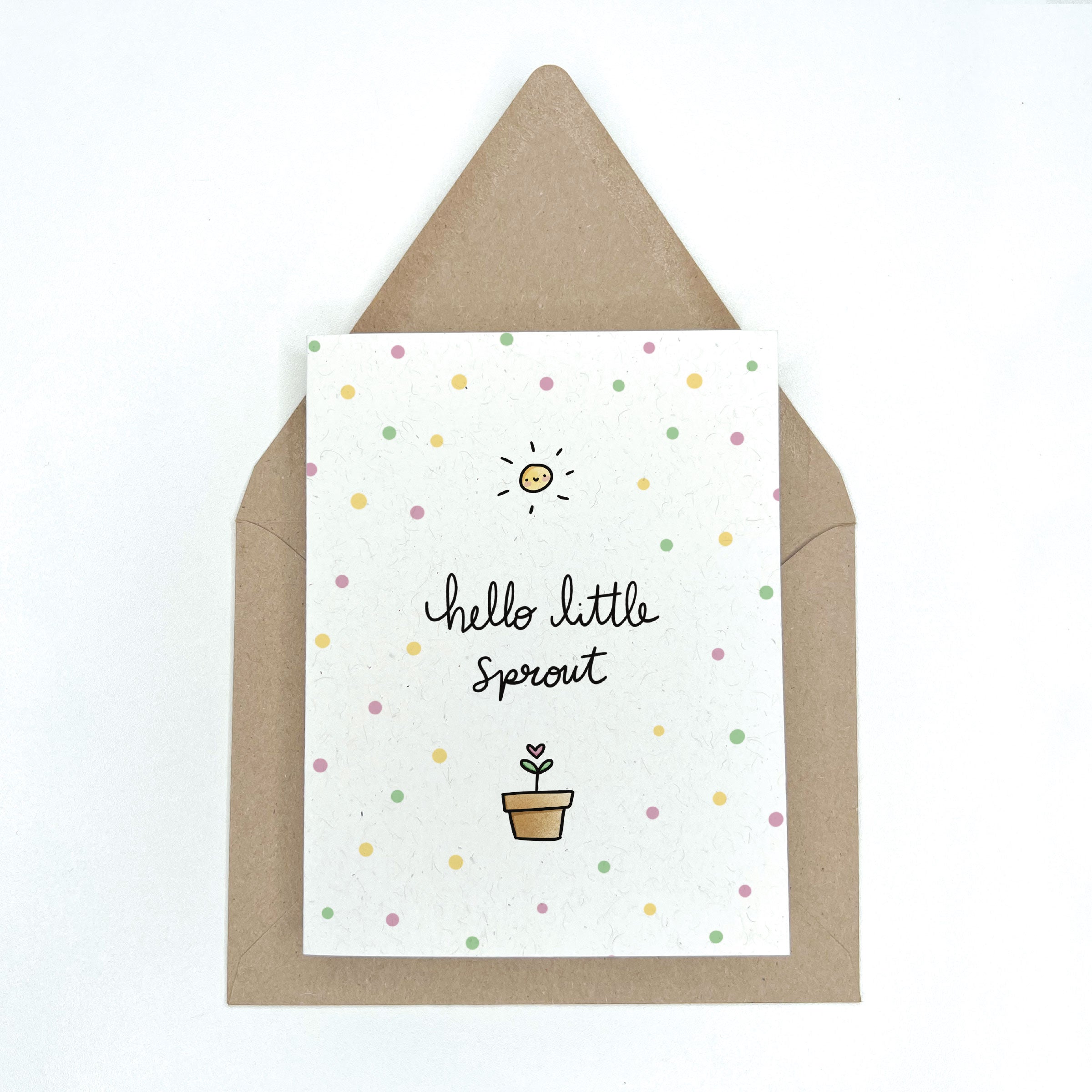 This eco friendly baby shower card features a whimsical hand-drawn image with a potted plant and happy sun and the phrase "Hello Little Sprout". This card for the mom-to-be can be used for a baby boy, baby girl, or a gender neutral shower. Blank on the inside. Paired with a kraft envelope.
