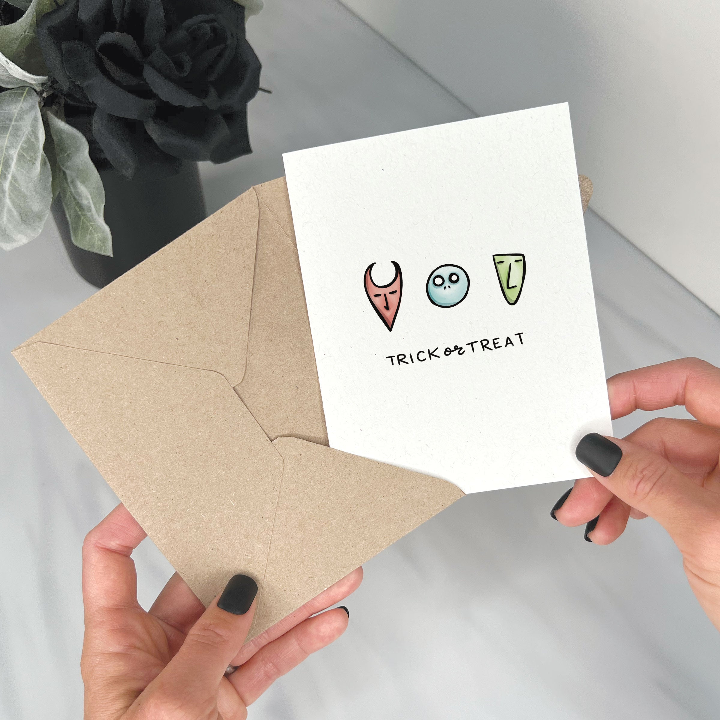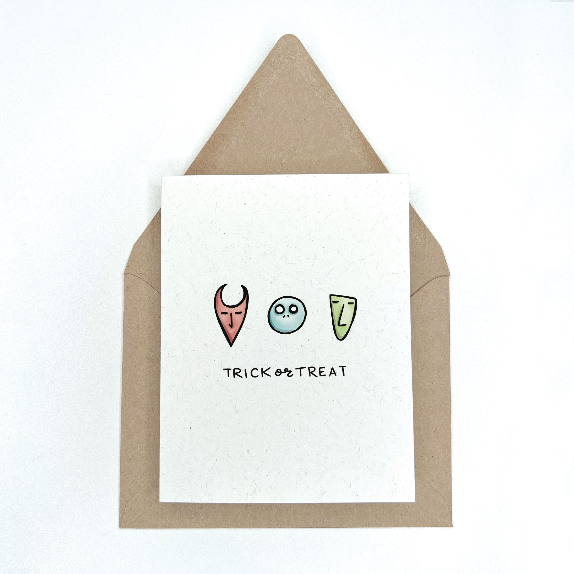 This eco friendly pop culture Halloween card features the 3 classic mischiefs from the movie The Nightmare Before Christmas- Lock, Shock, & Barrel with the phrase "Trick or Treat" below them. Perfect for family, friends, students, or coworkers. Blank on the inside. Paired with a kraft envelope.