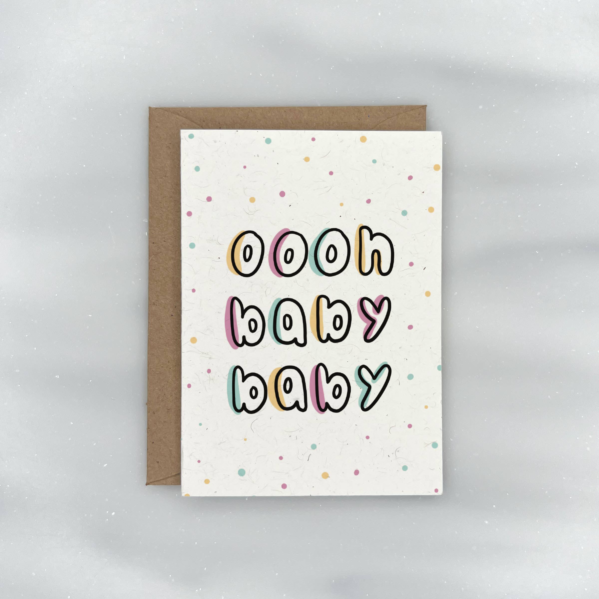 This eco friendly baby shower card features "oooh baby baby" in colorful text. This can be used for a baby boy, baby girl, or a gender neutral shower. Blank on the inside. Paired with a kraft envelope.