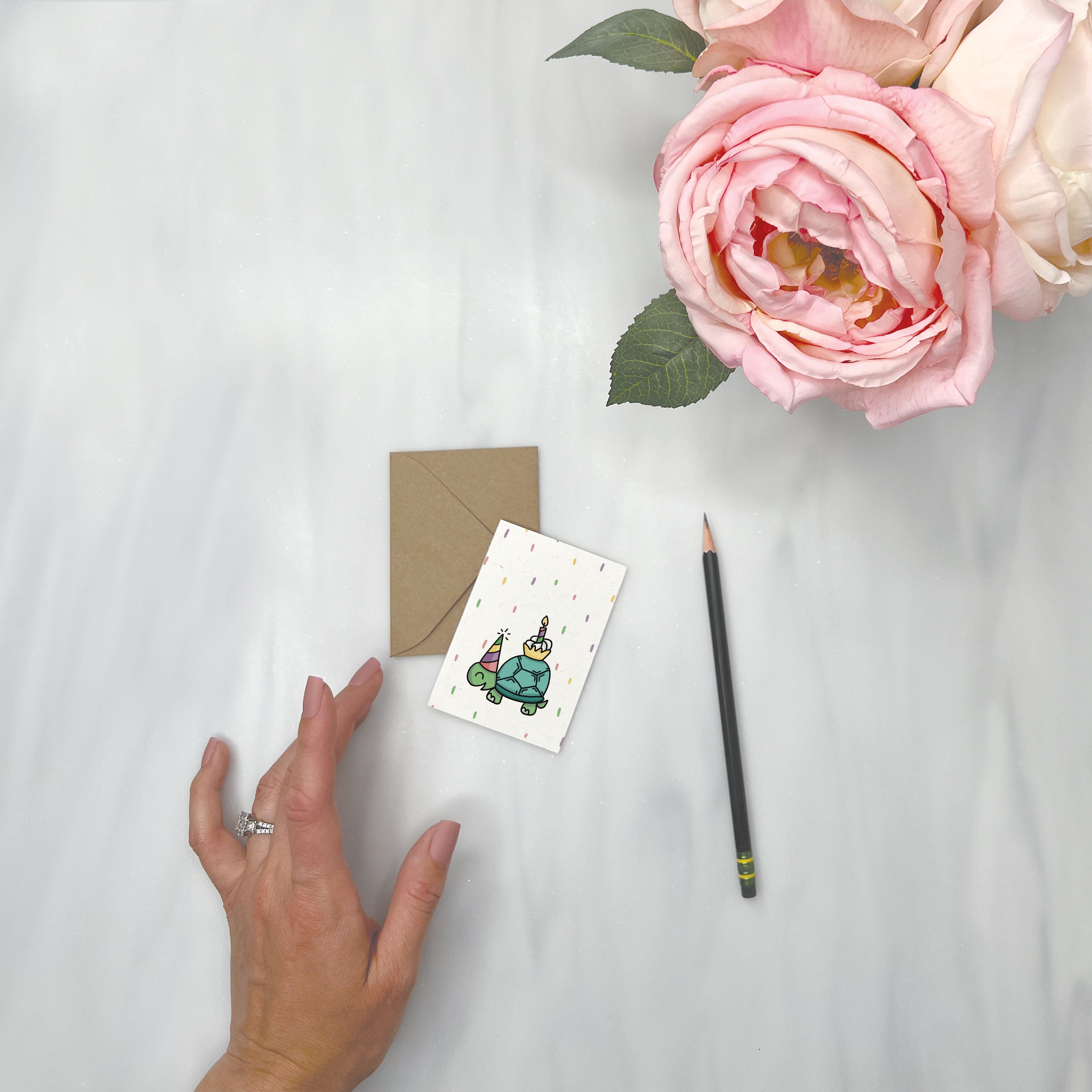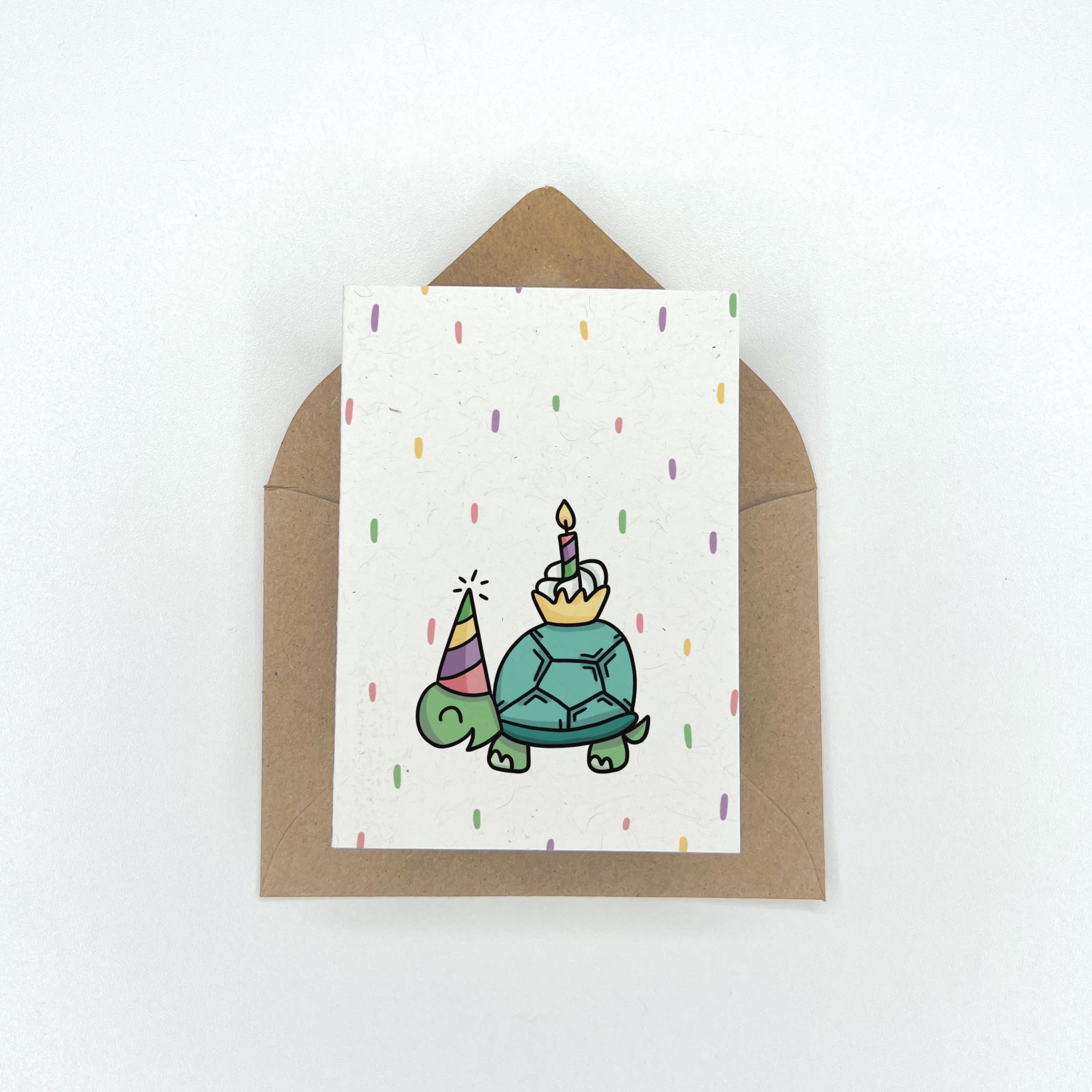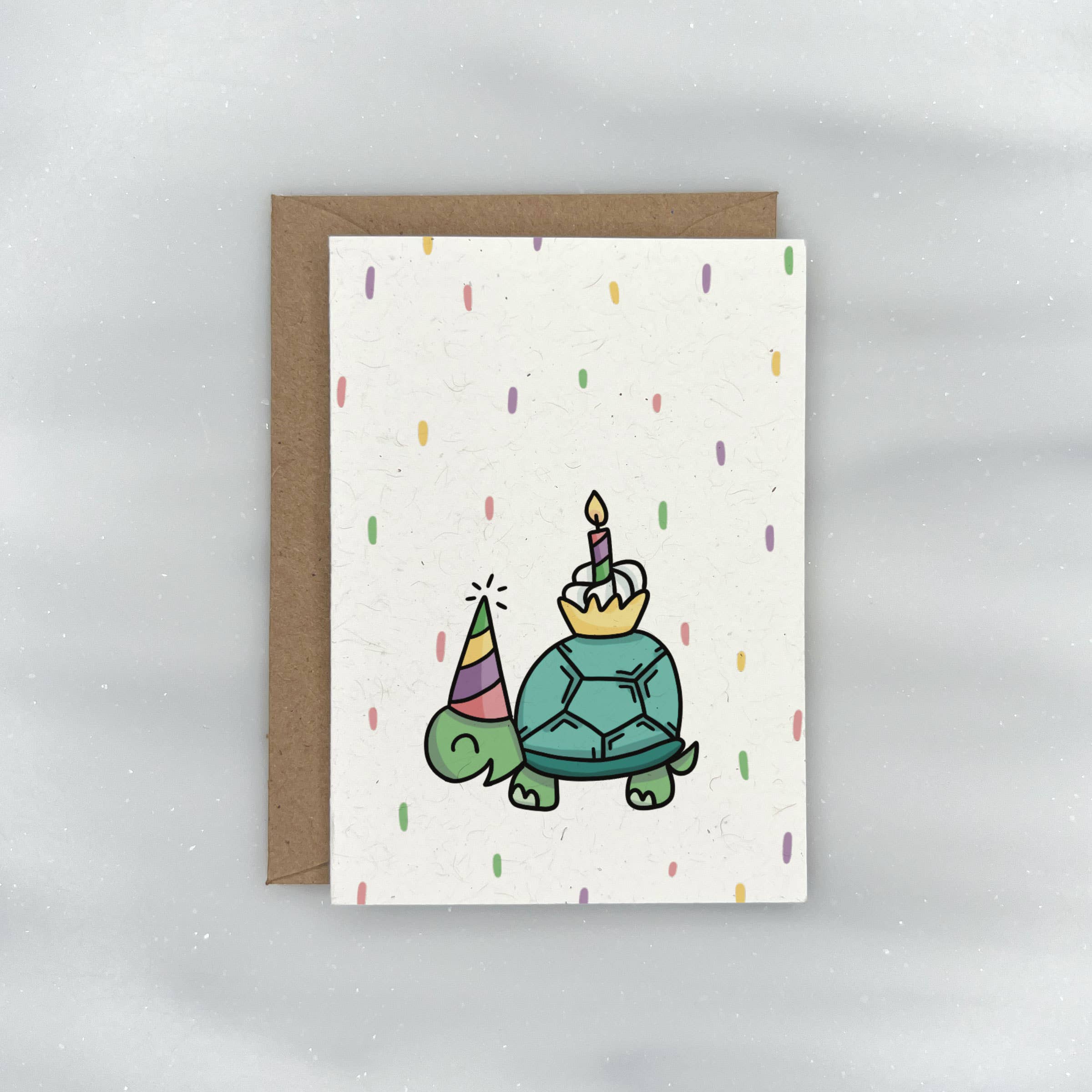 This eco friendly gift enclosure card features a cute green turtle wearing a party hat and carrying a cupcake on its back- great for kids and adults alike. Blank on the inside. Paired with a kraft envelope.