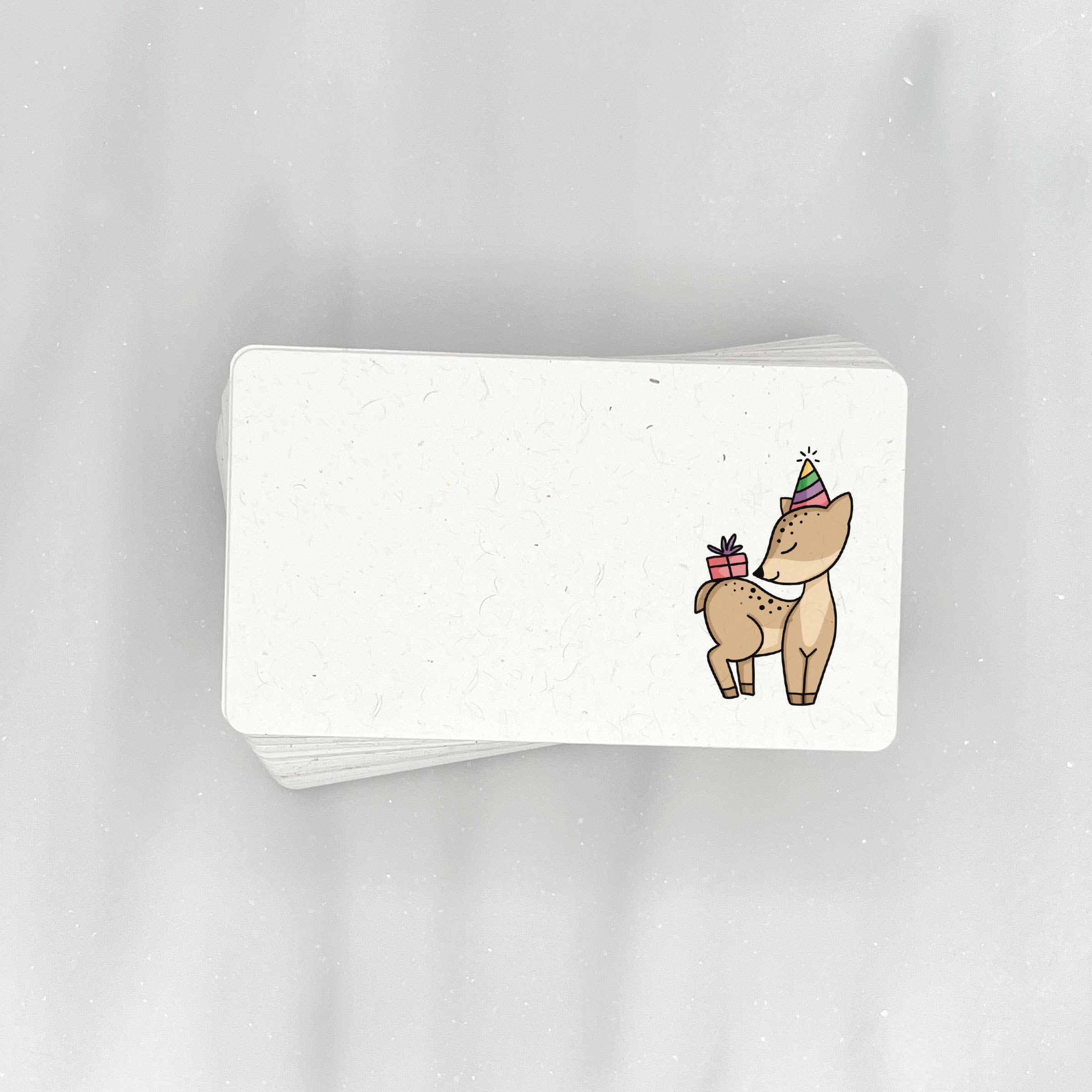 These eco friendly mini note cards feature a cute deer and are great for kids and adults alike. Design on the front. Blank on the back. 56 mini notes per pack.