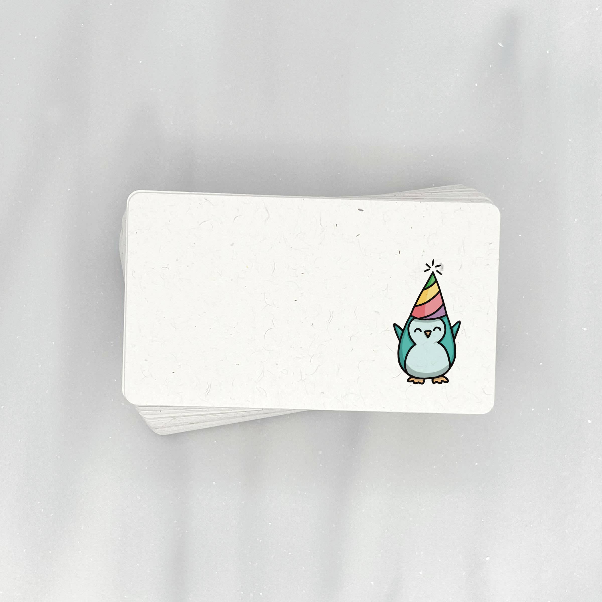 These eco friendly mini note cards feature a cute penguin with party hat and are great for kids and adults alike. Design on the front. Blank on the back. 56 mini notes per pack.