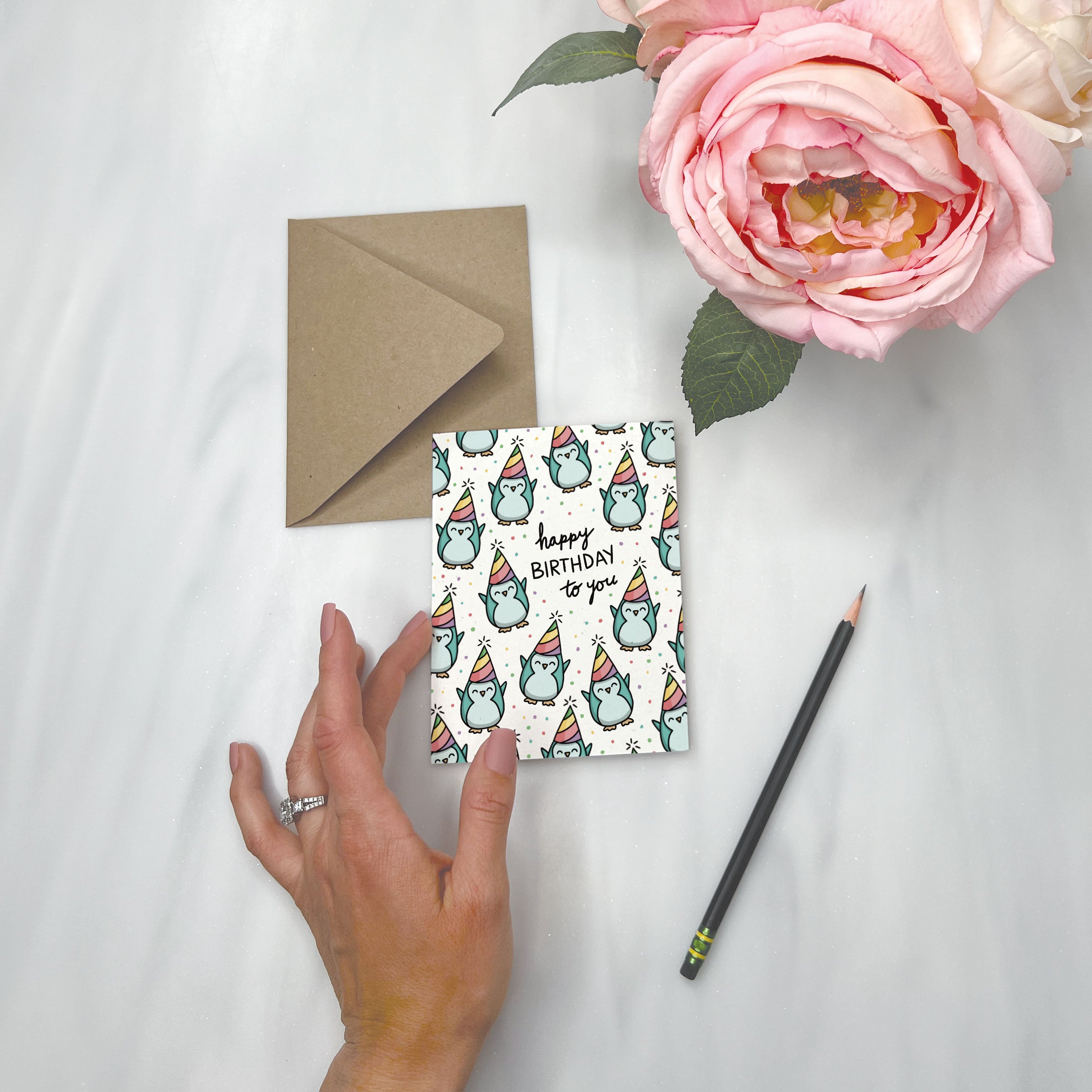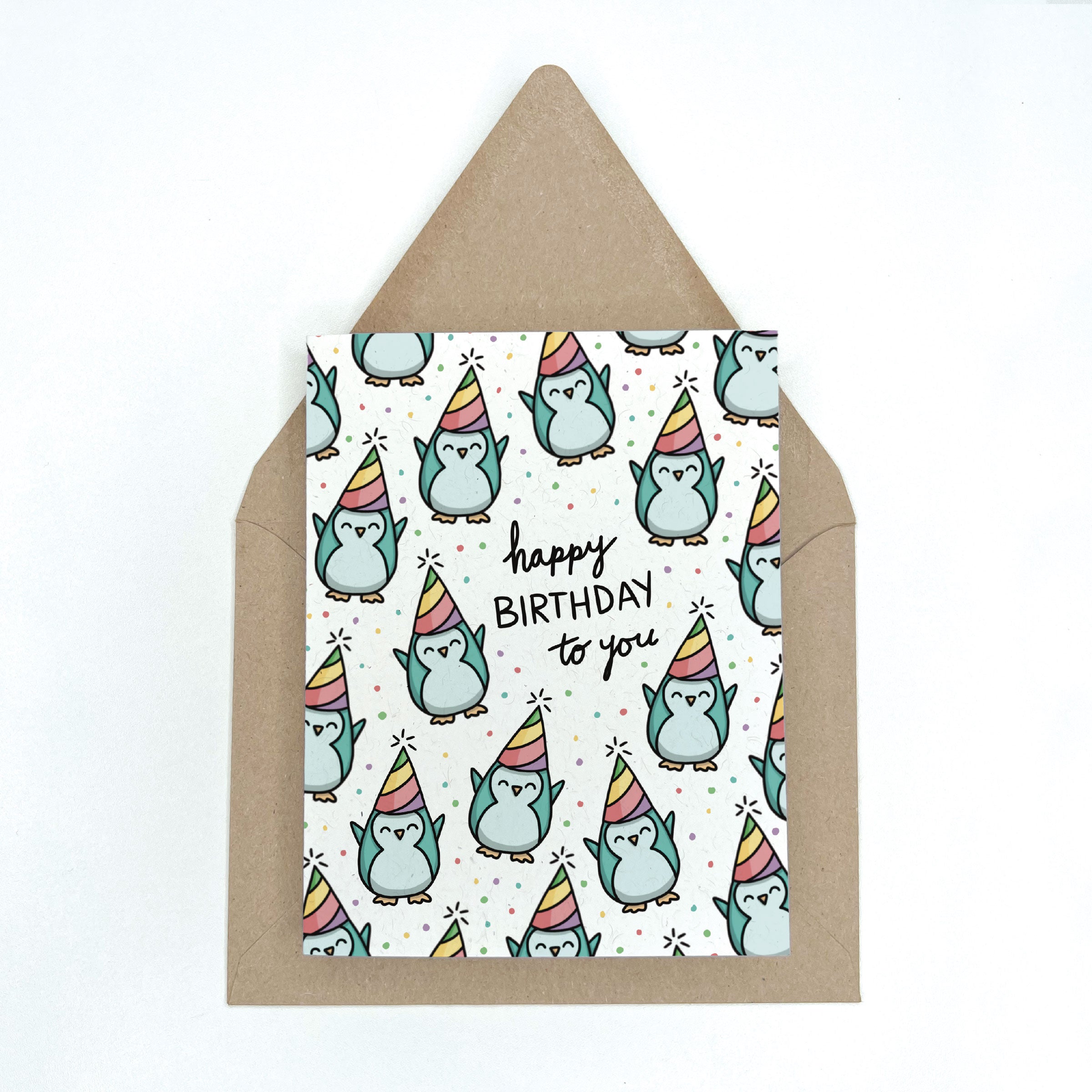 This eco friendly birthday card features a cute pattern of penguins with party hats on along with the handwritten phrase "happy Birthday to you". Perfect for both children & adults alike. Blank on the inside. Paired with a kraft envelope.