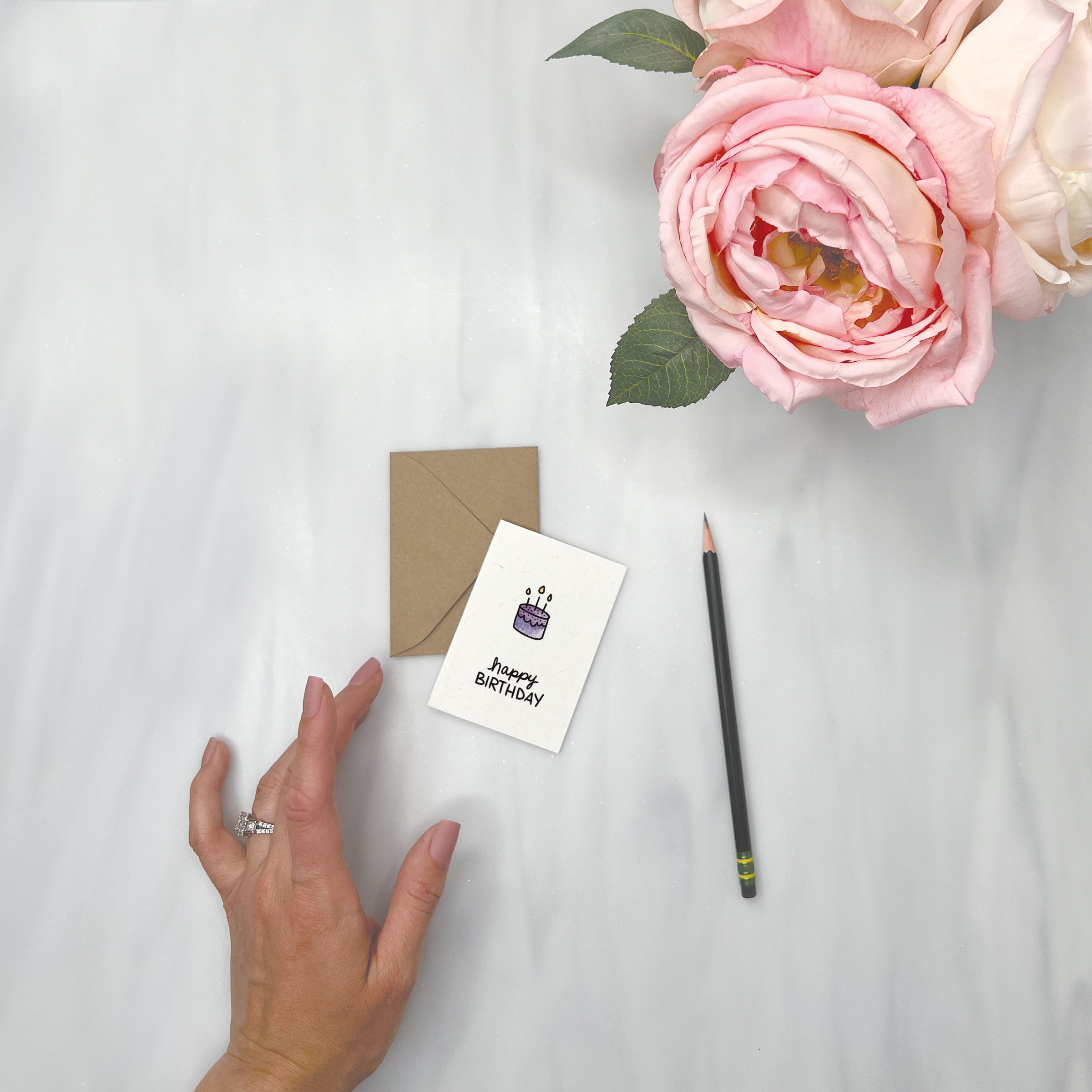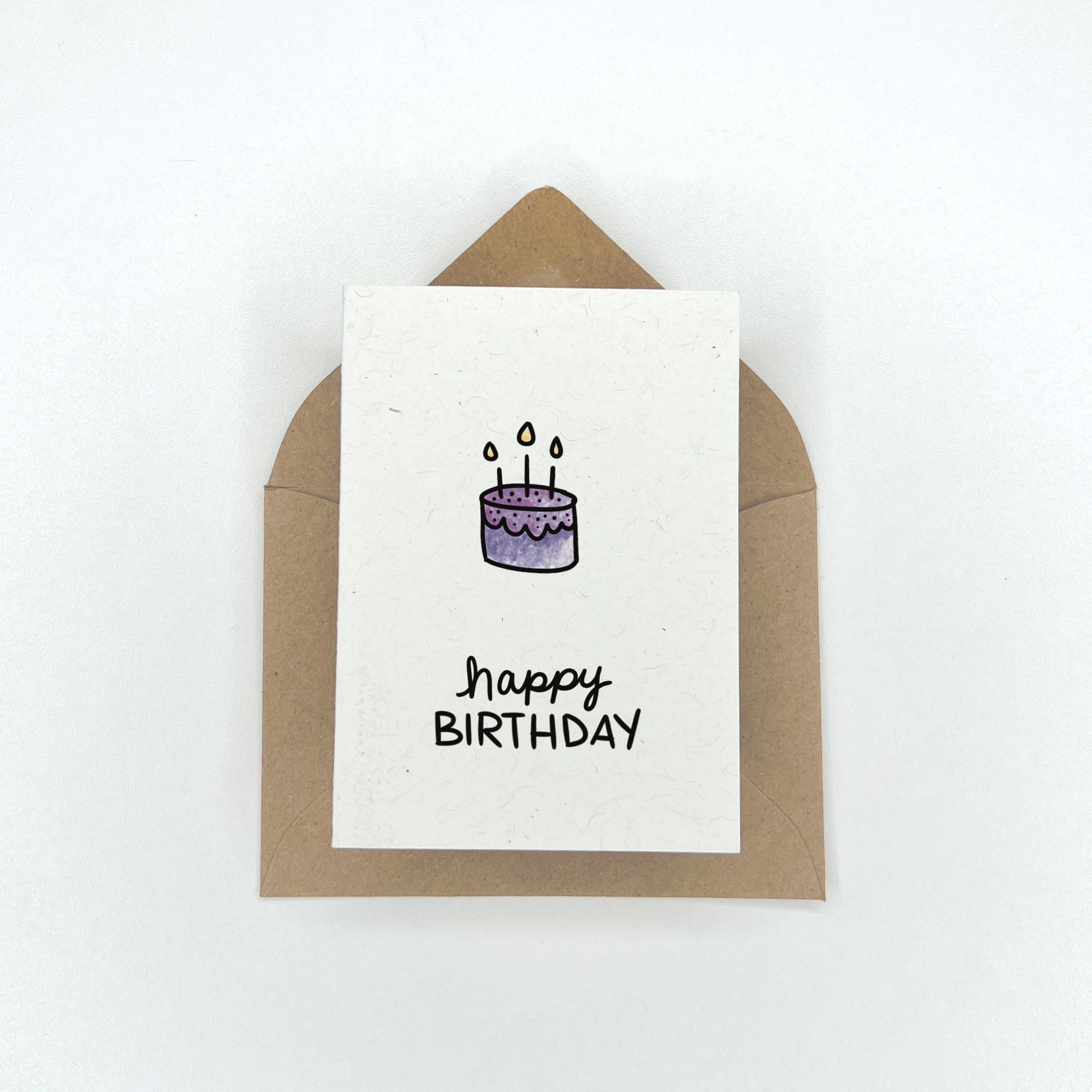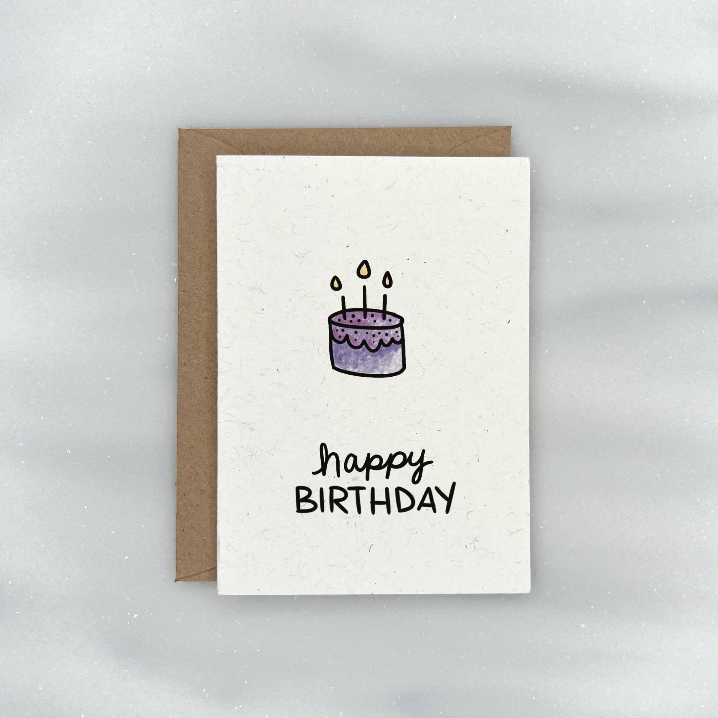This eco friendly gift enclosure card features a purple cake and the phrase "Happy Birthday"- great for kids and adults alike. Blank on the inside. Paired with a kraft envelope.