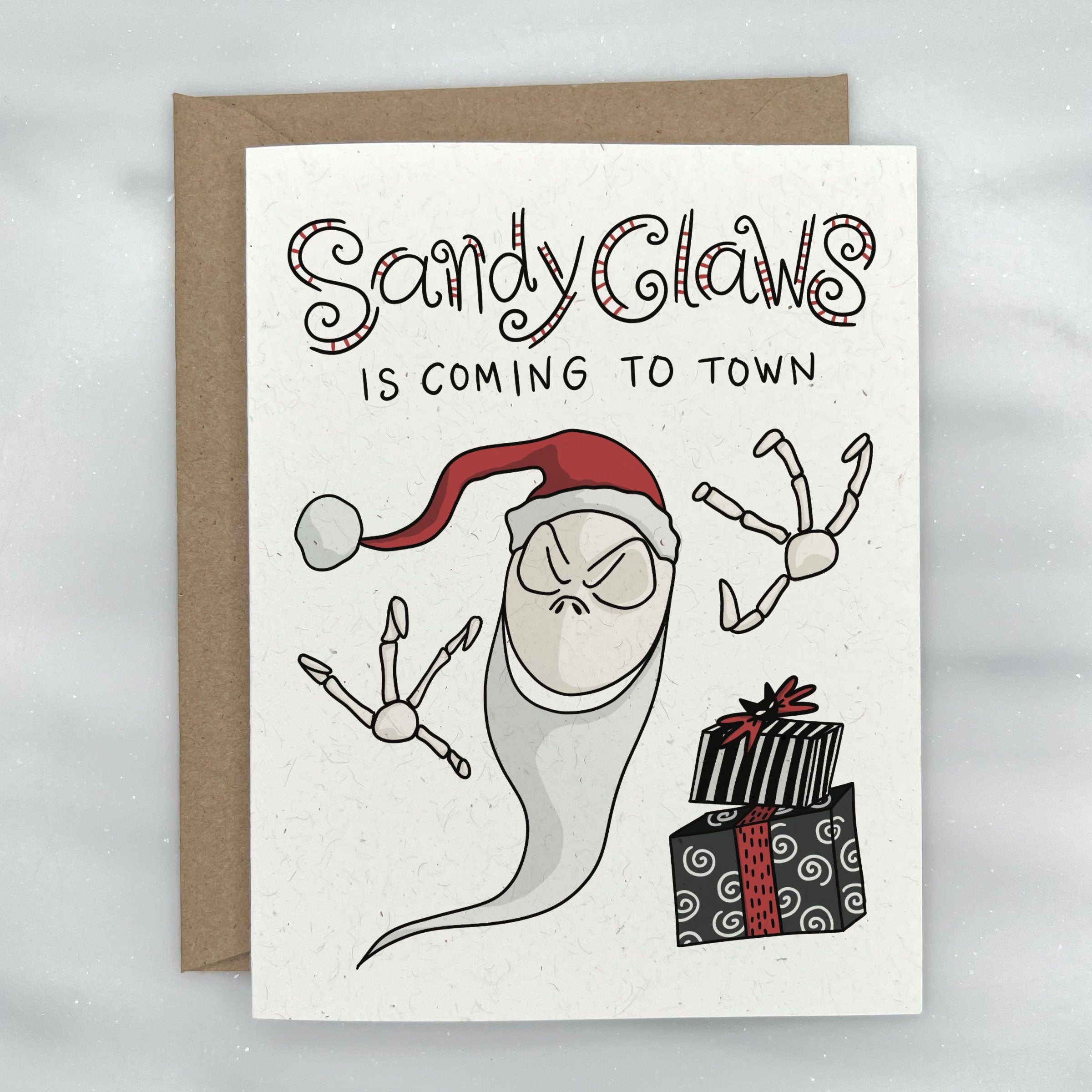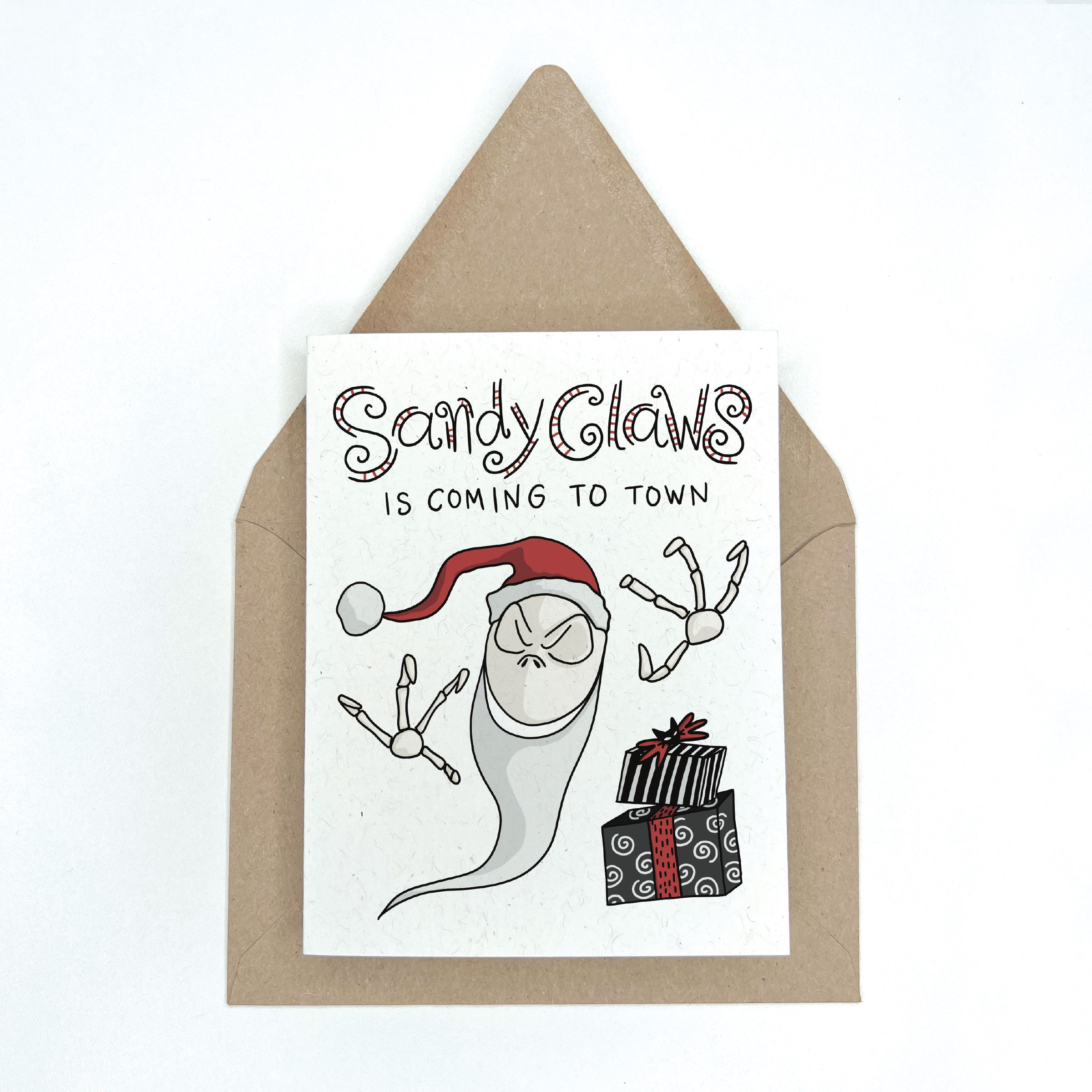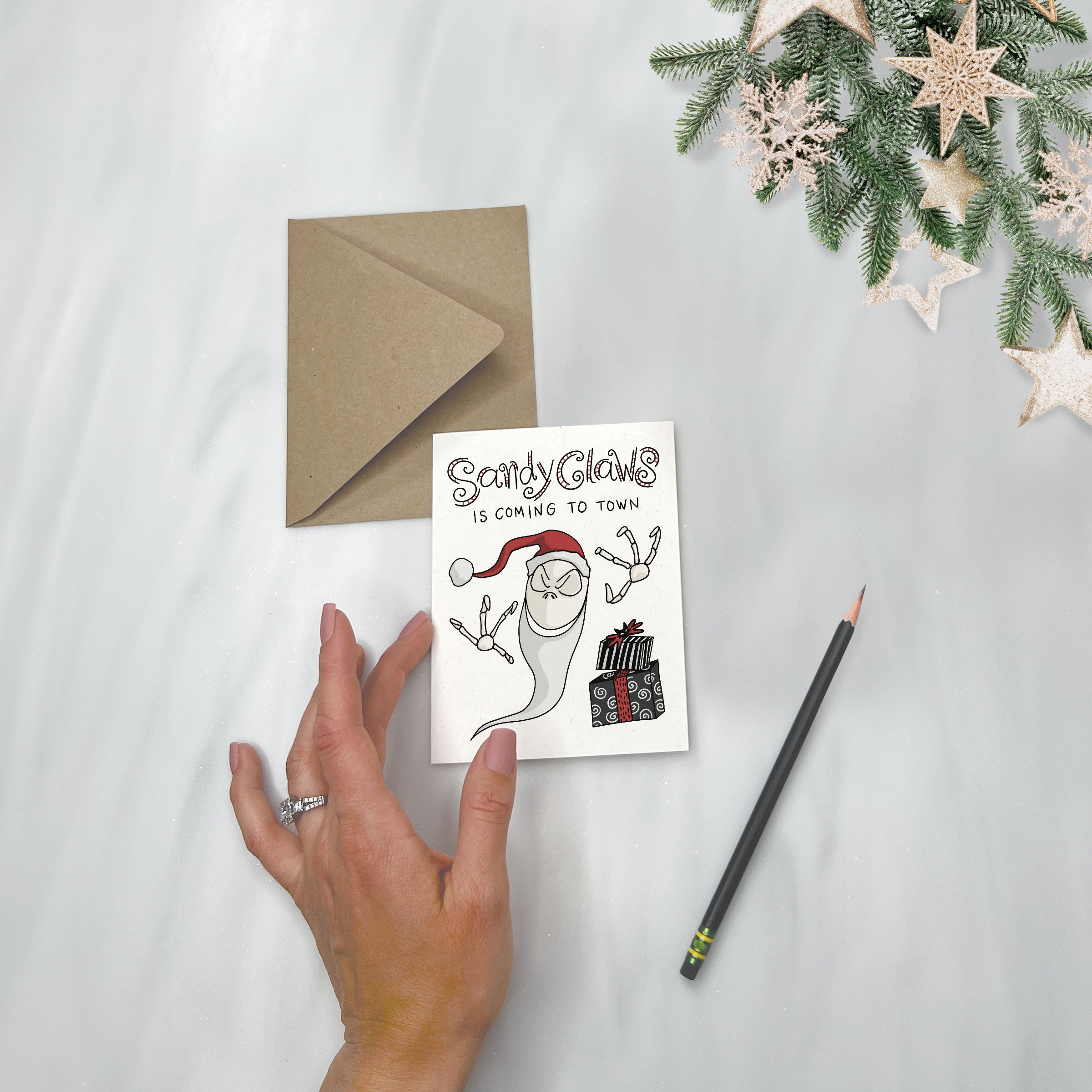 This eco friendly pop culture Christmas card features the beloved Jack Skellington along with the phrase "Sandy Claws is coming to town". Perfect as Christmas Cards or Holiday Cards for family, friends, students, or coworkers. Blank on the inside. Paired with a kraft envelope.