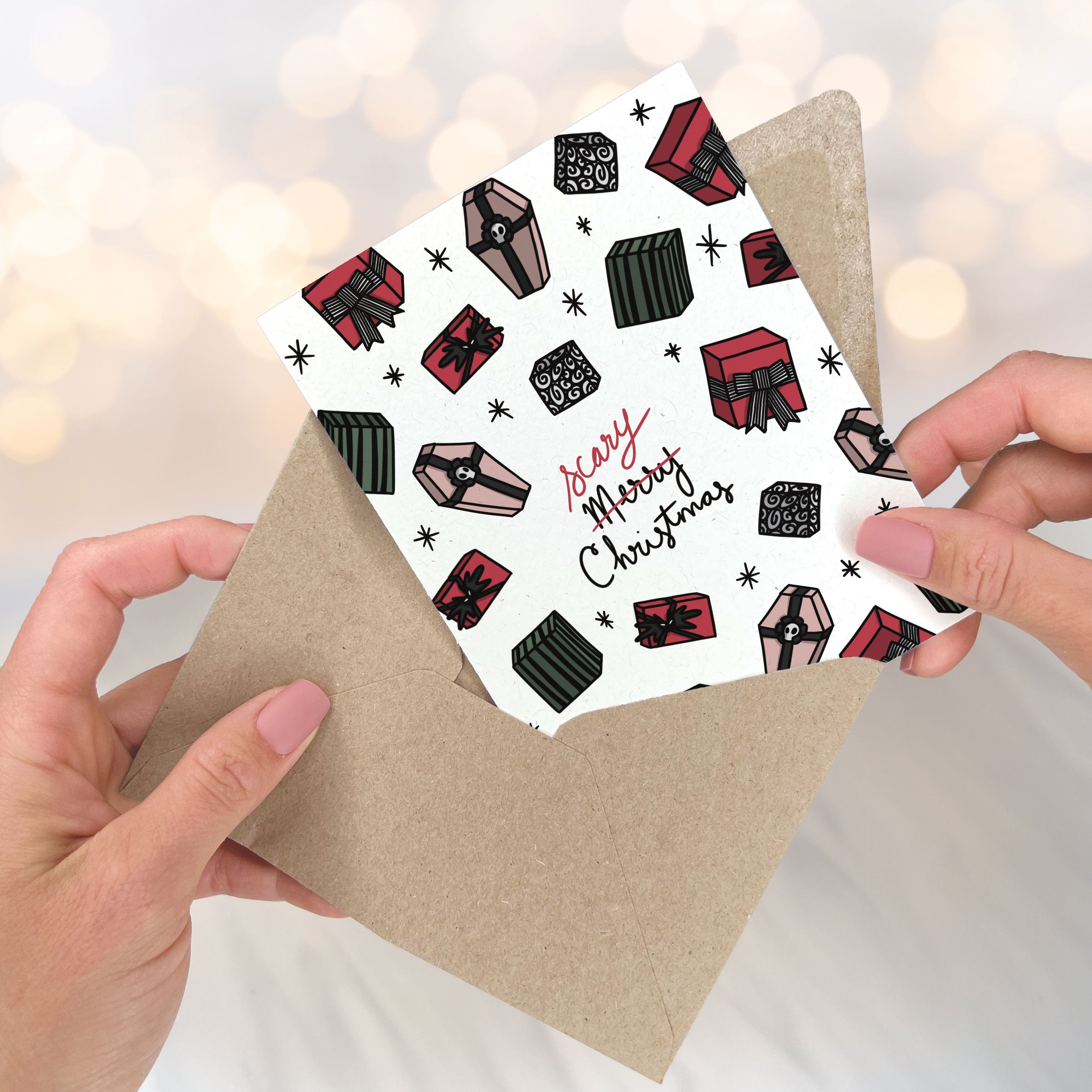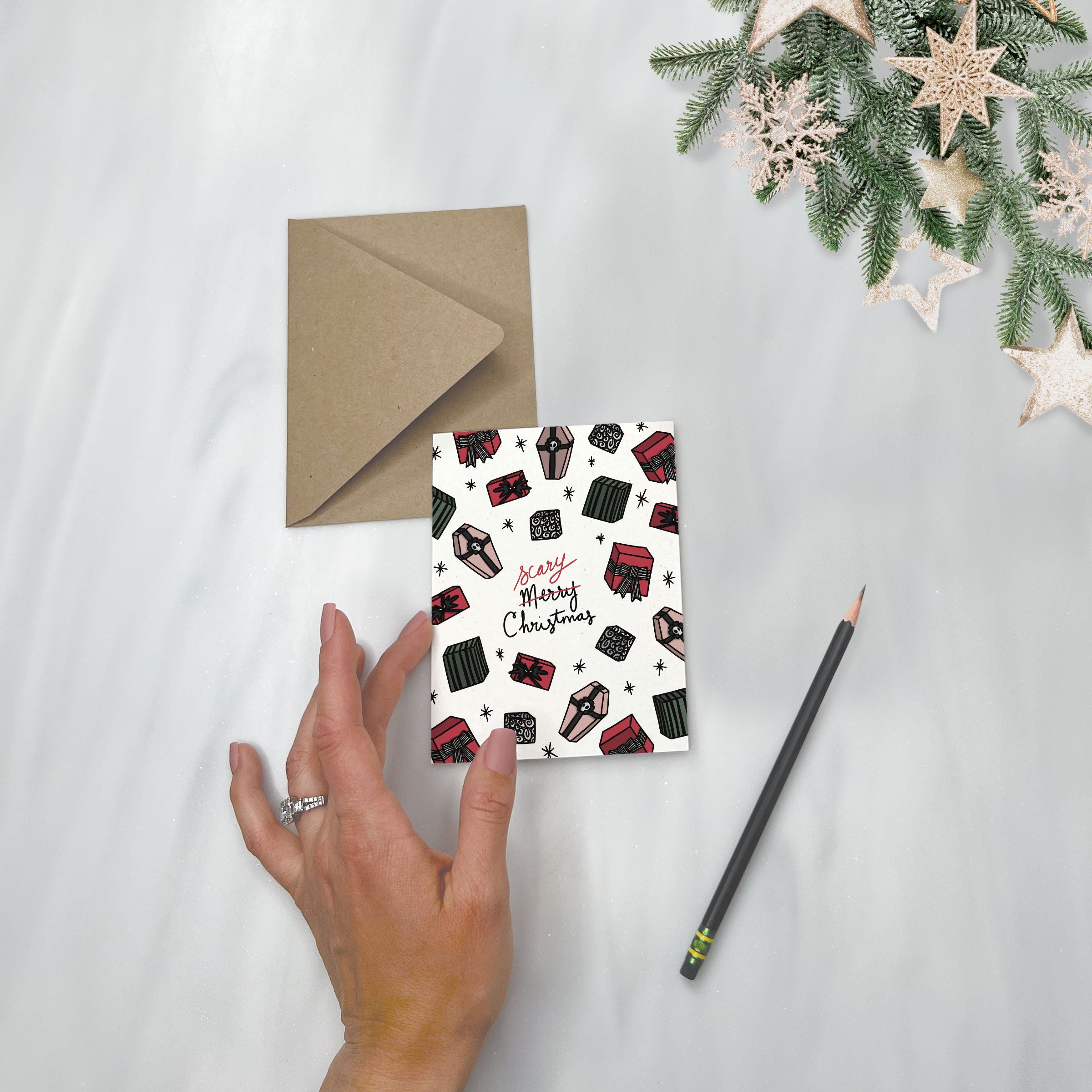 This eco friendly pop culture Christmas card features a delightful pattern of boxes and coffins inspired by the one and only "Nightmare before Christmas" with the phrase "Scary Christmas" with the word "Merry" crossed off and changed to "Scary" . Perfect for family, friends, students, or coworkers. Blank on the inside. Paired with a kraft envelope.