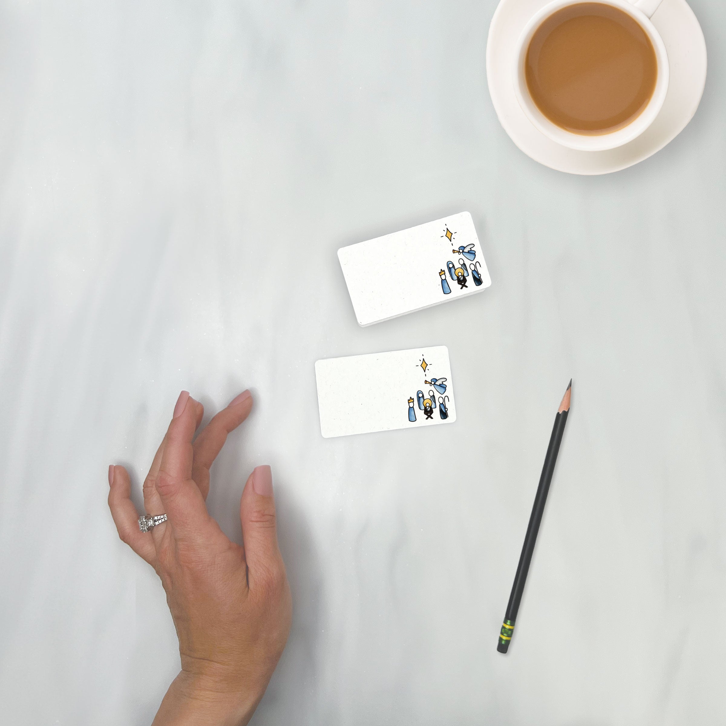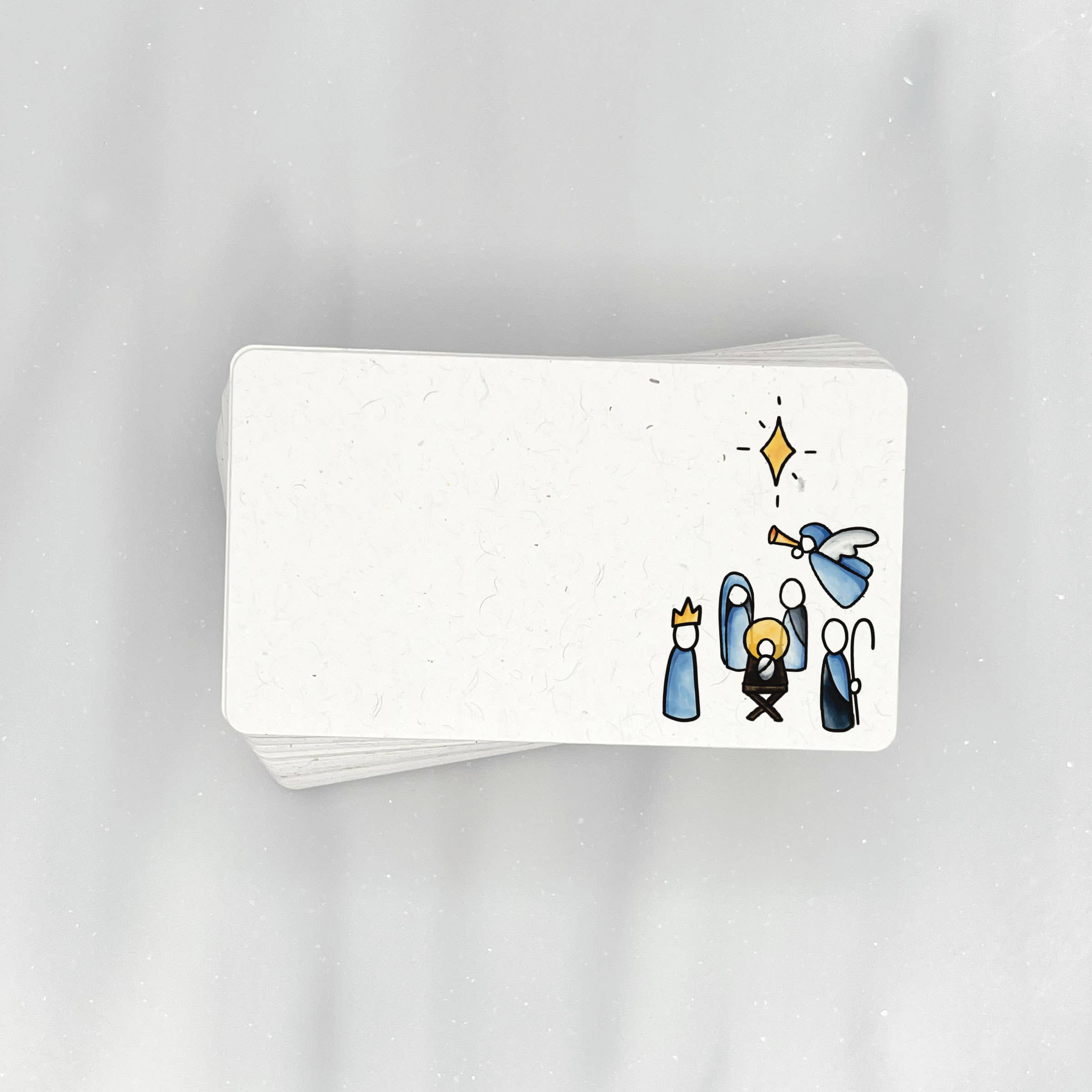 These eco friendly mini note cards feature a simple Nativity scene and are great for kids and adults alike. Design on the front. Blank on the back. 56 mini notes per pack.