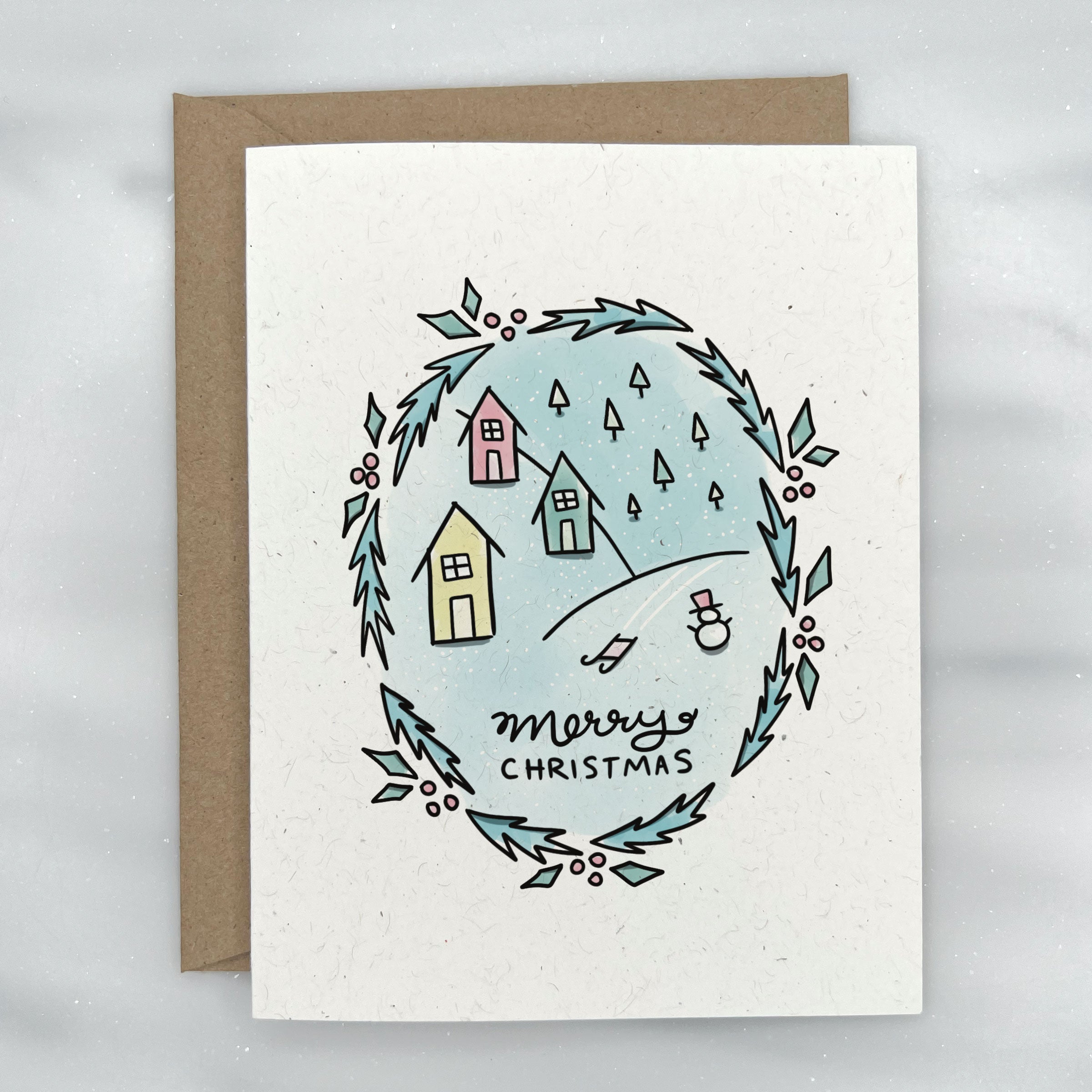 This minimal Christmas card features a cute scene of a snowy winter village with hills, trees, sleds, & snowman and the handwritten phrase "Merry Christmas" in the center. Perfect for both children & adults alike. Blank on the inside. Paired with a kraft envelope.