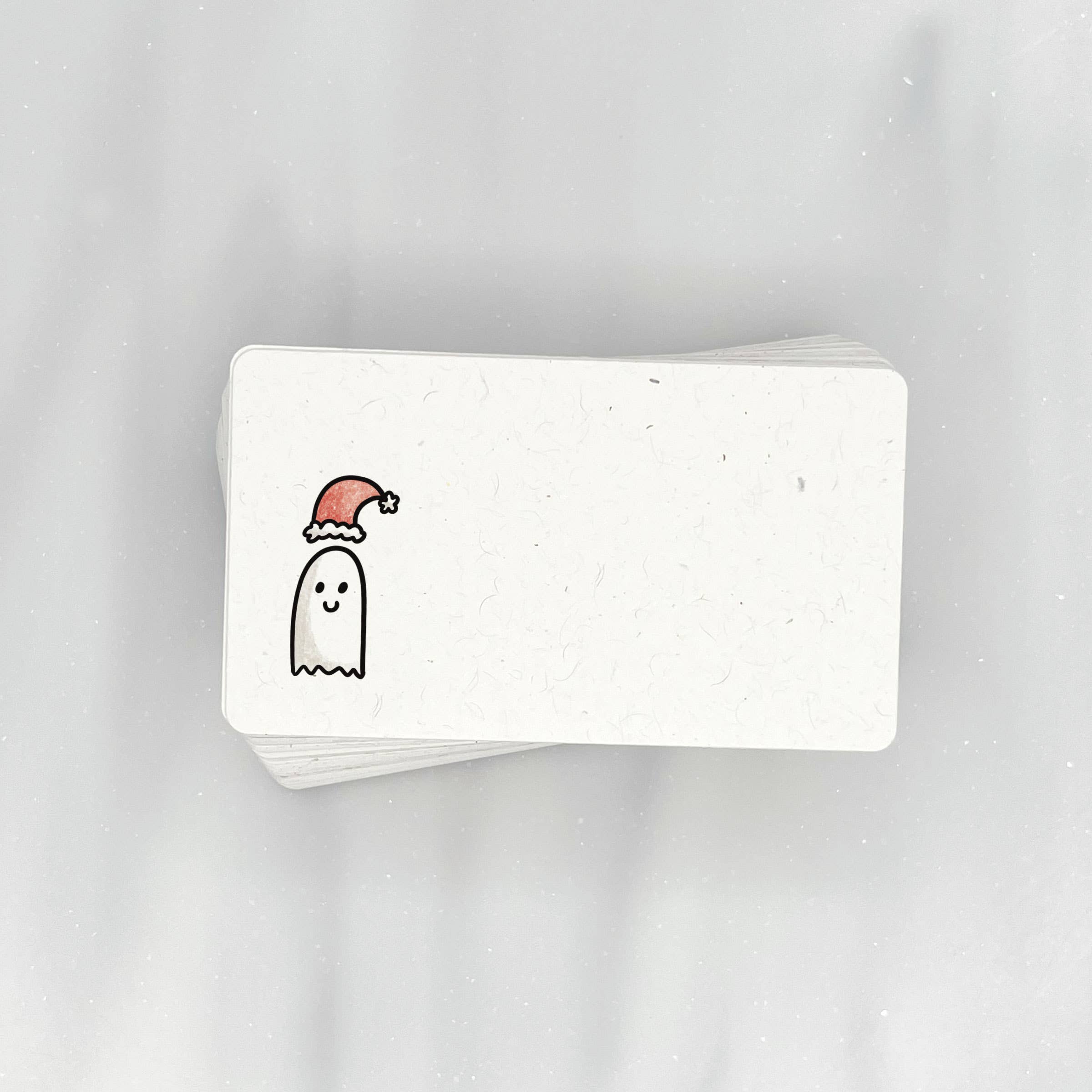 These eco friendly mini note cards feature a cute ghost with Santa hat and are great for kids and adults alike. Design on the front. Blank on the back. 56 mini notes per pack.