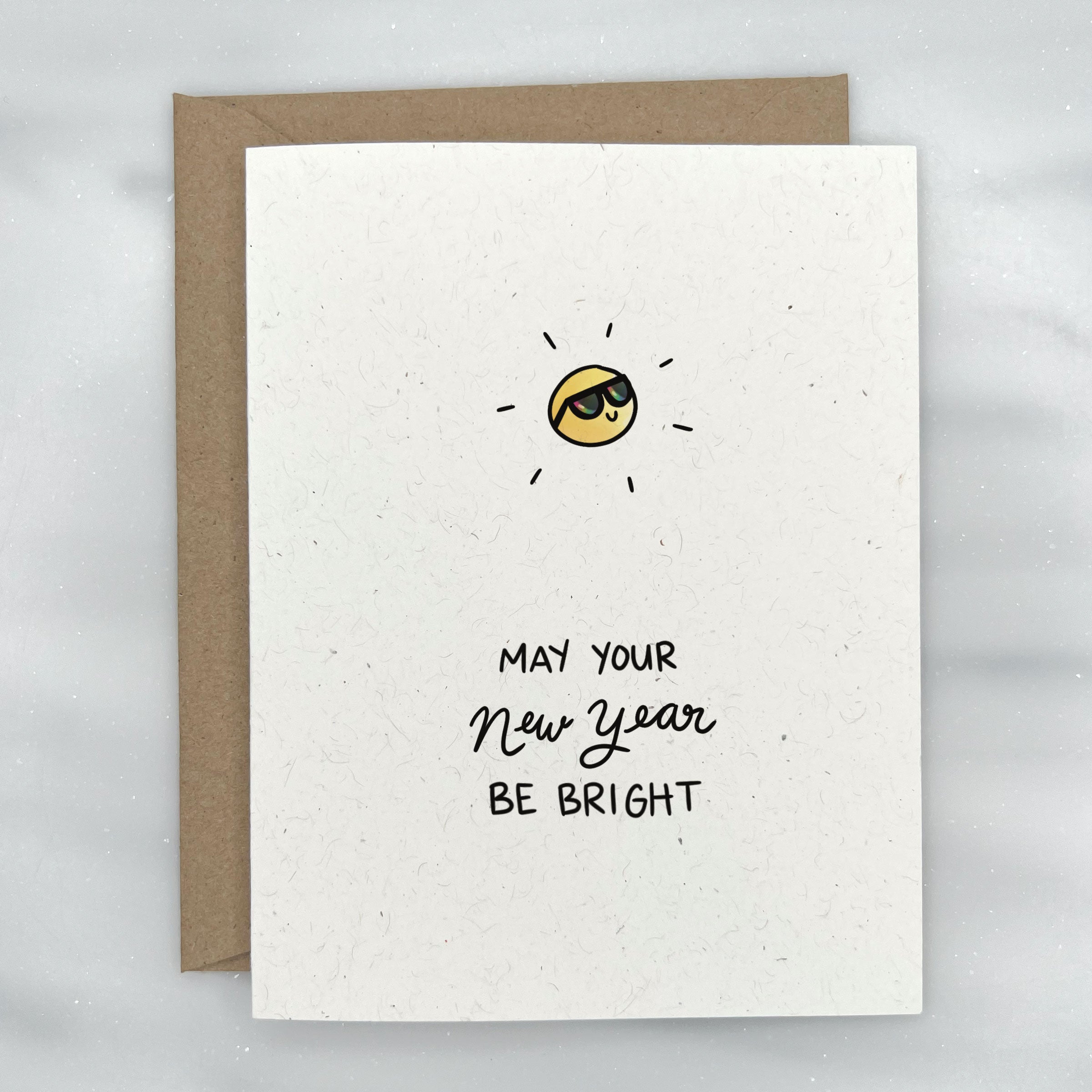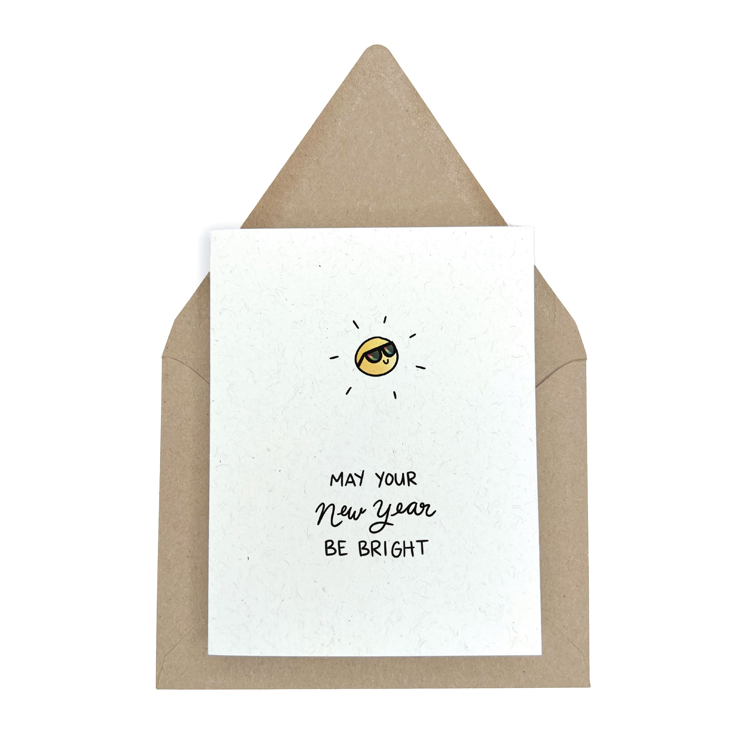 This eco friendly New Year's card features an illustration of a sun with sunglasses on and the handwritten phrase "May Your New Year Be Bright" underneath. Perfect for friends & family. Blank on the inside. Paired with a kraft envelope.