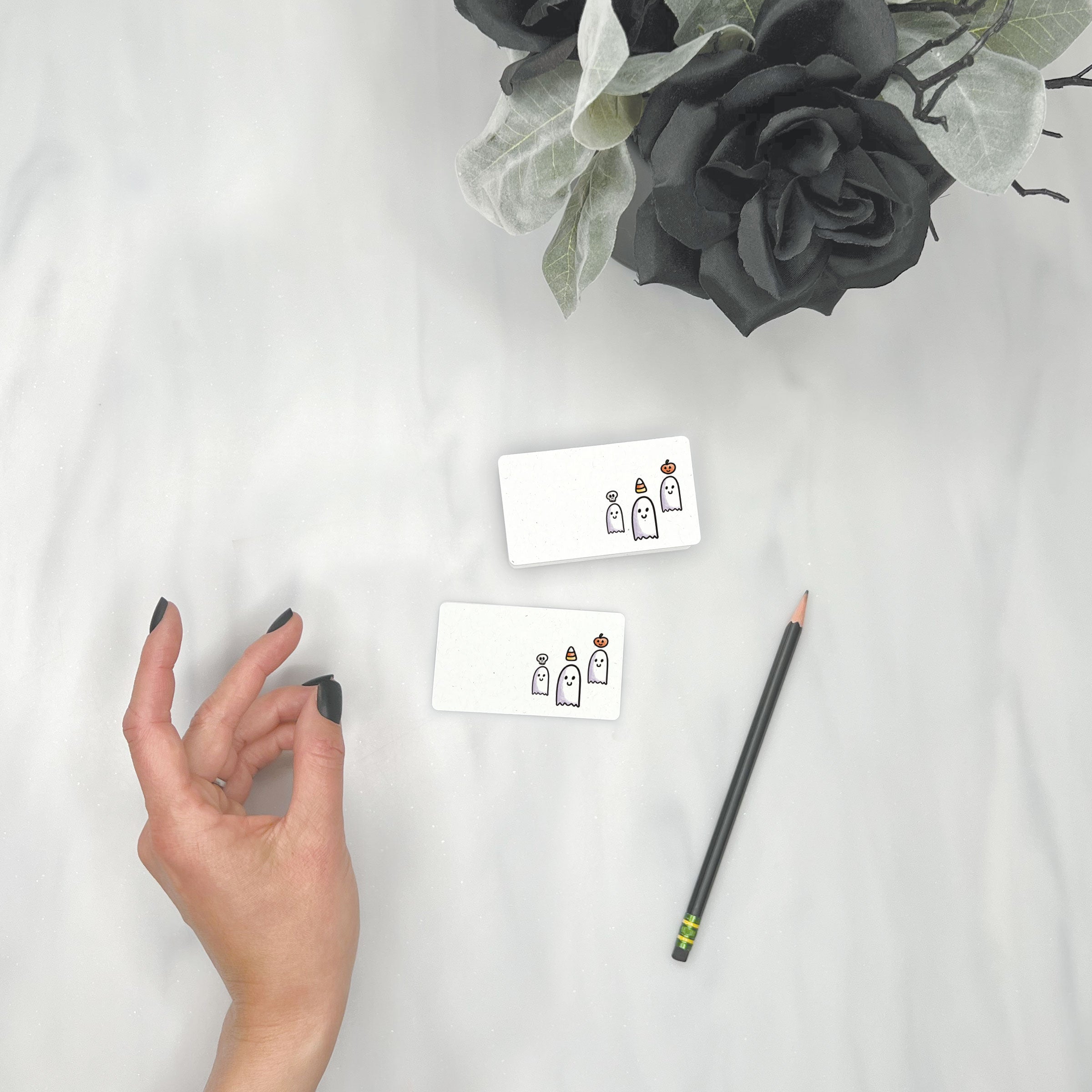 These eco friendly mini note cards feature 3 ghosts and are great for kids and adults alike. Design on the front. Blank on the back. 56 mini notes per pack.