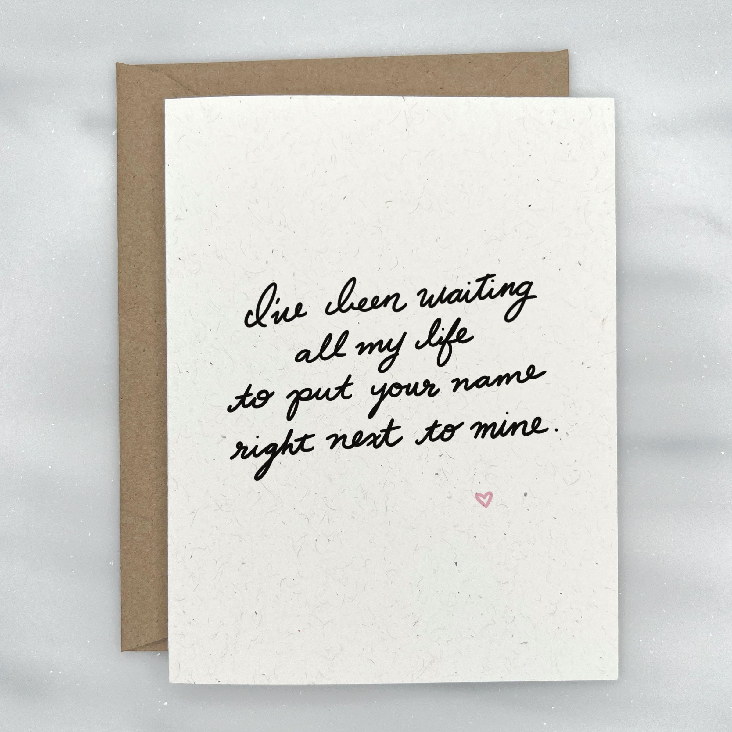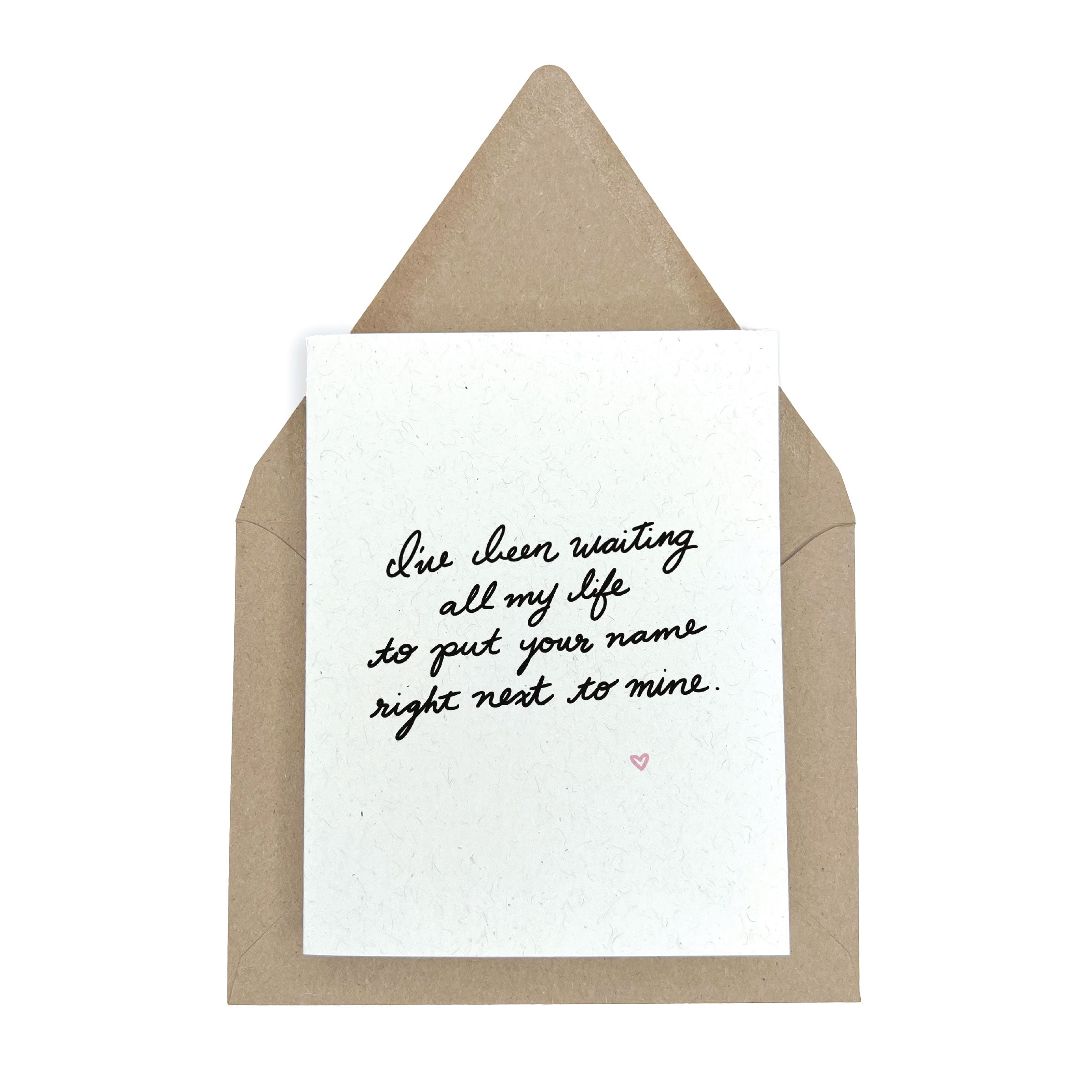 This eco friendly love card is perfect for a spouse to give to another spouse with a special keepsake note on the day of their wedding. This minimal card has the phrase "I've been waiting all my life to put your name right next to mine" written on the front. Blank on the inside. Paired with a kraft envelope.