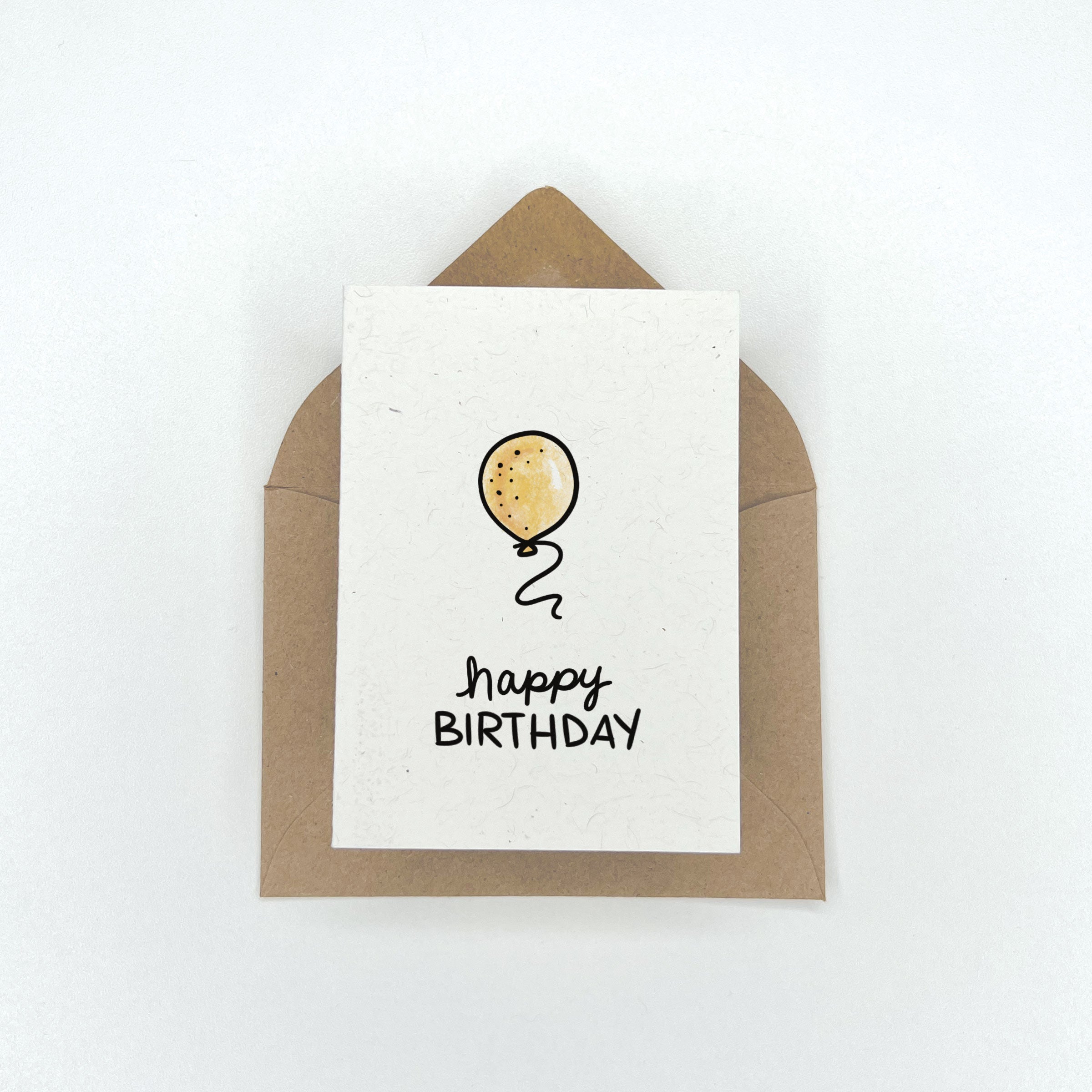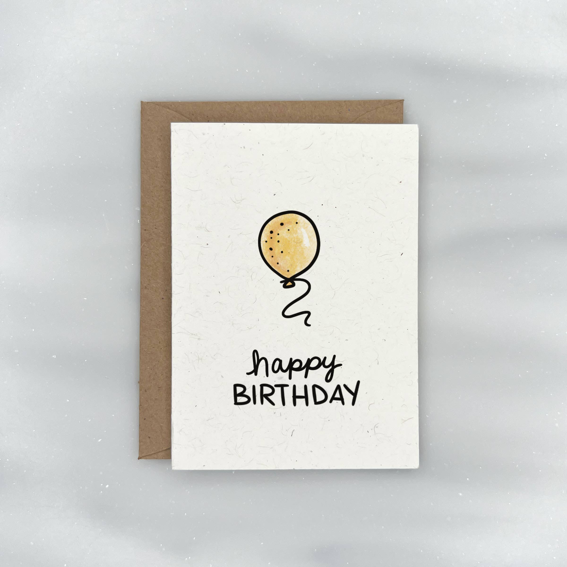 This eco friendly gift enclosure card features a yellow balloon and the phrase "Happy Birthday"- great for kids and adults alike. Blank on the inside. Paired with a kraft envelope.