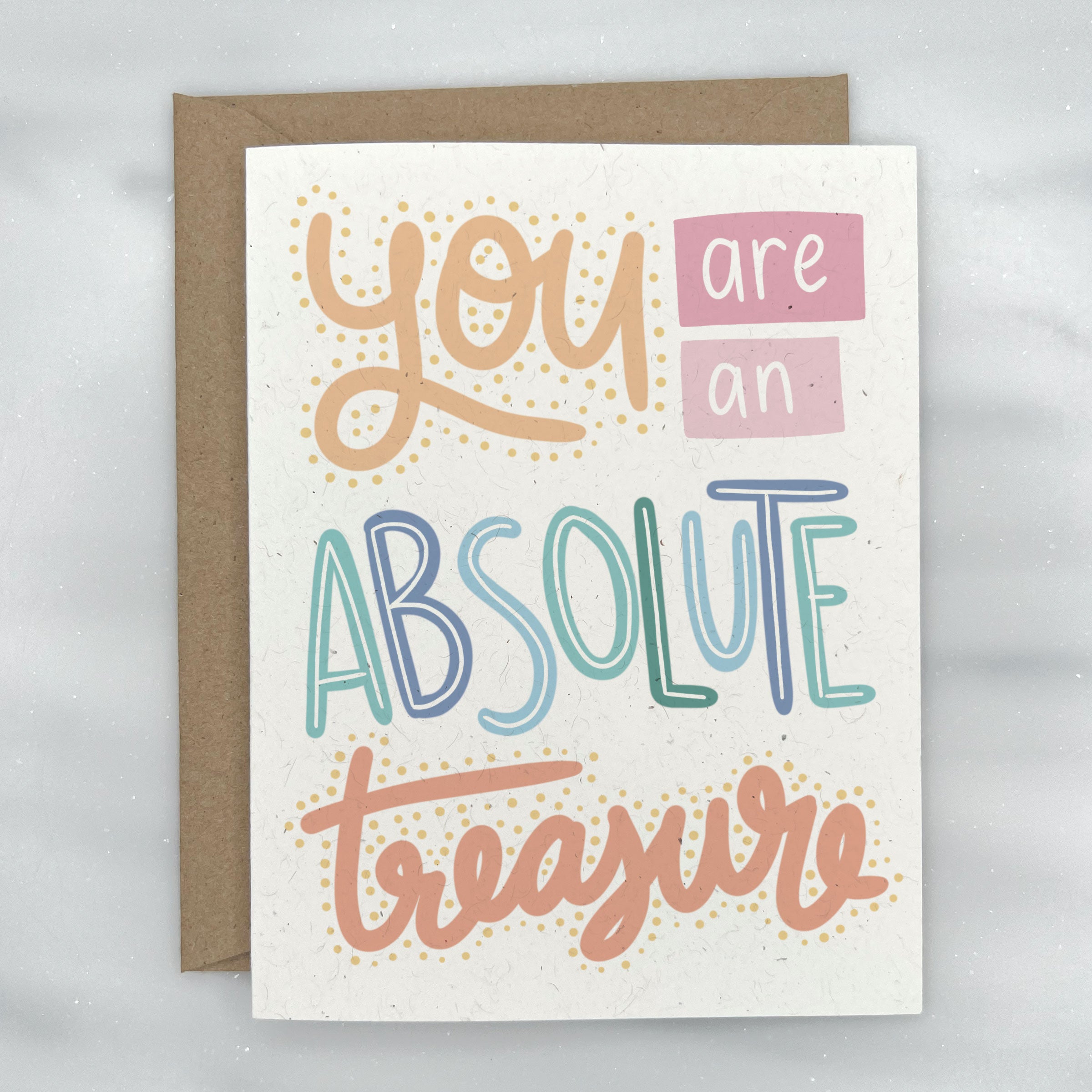 This cute eco friendly friendship card features the phrase "You are an absolute treasure" beautifully written in pretty colors over the front. Great as a love card, friendship card, anniversary card, or even a Valentine's Day card. Perfect for both children & adults alike. Blank on the inside. Paired with a kraft envelope.