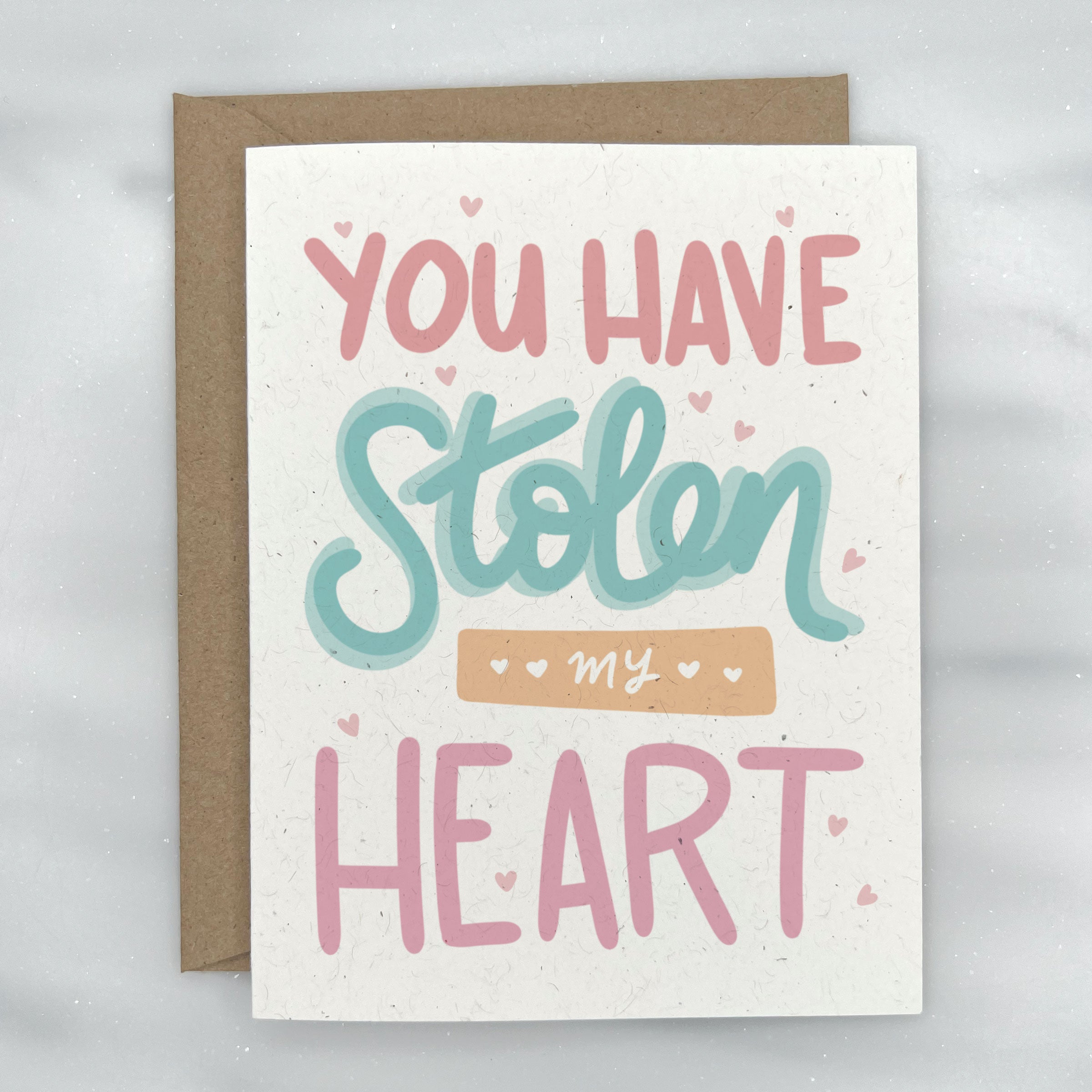 This cute eco friendly love card features the phrase "You have stolen my heart" in pretty colors over the front. Great as an everyday love card, anniversary card, or even a Valentine's Day card. Perfect for both children & adults alike. Blank on the inside. Paired with a kraft envelope.