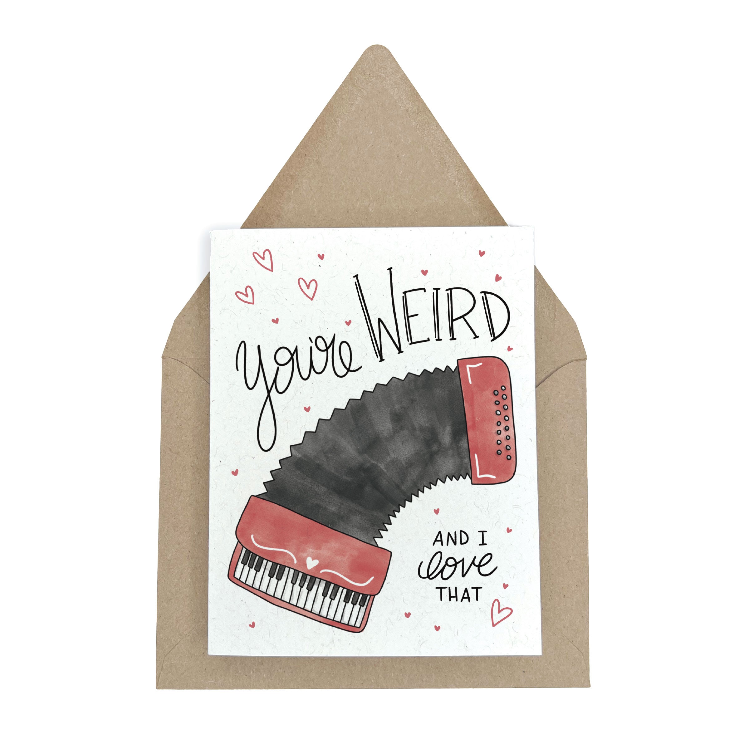 This eco friendly pop culture congratulations card pays tribute to the one and only Weird Al Yankovic by featuring an accordion and the phrase "You're Weird and I Love That" written below. Perfect for anniversaries or Valentine's day for any recipient. Blank on the inside. Paired with a kraft envelope.